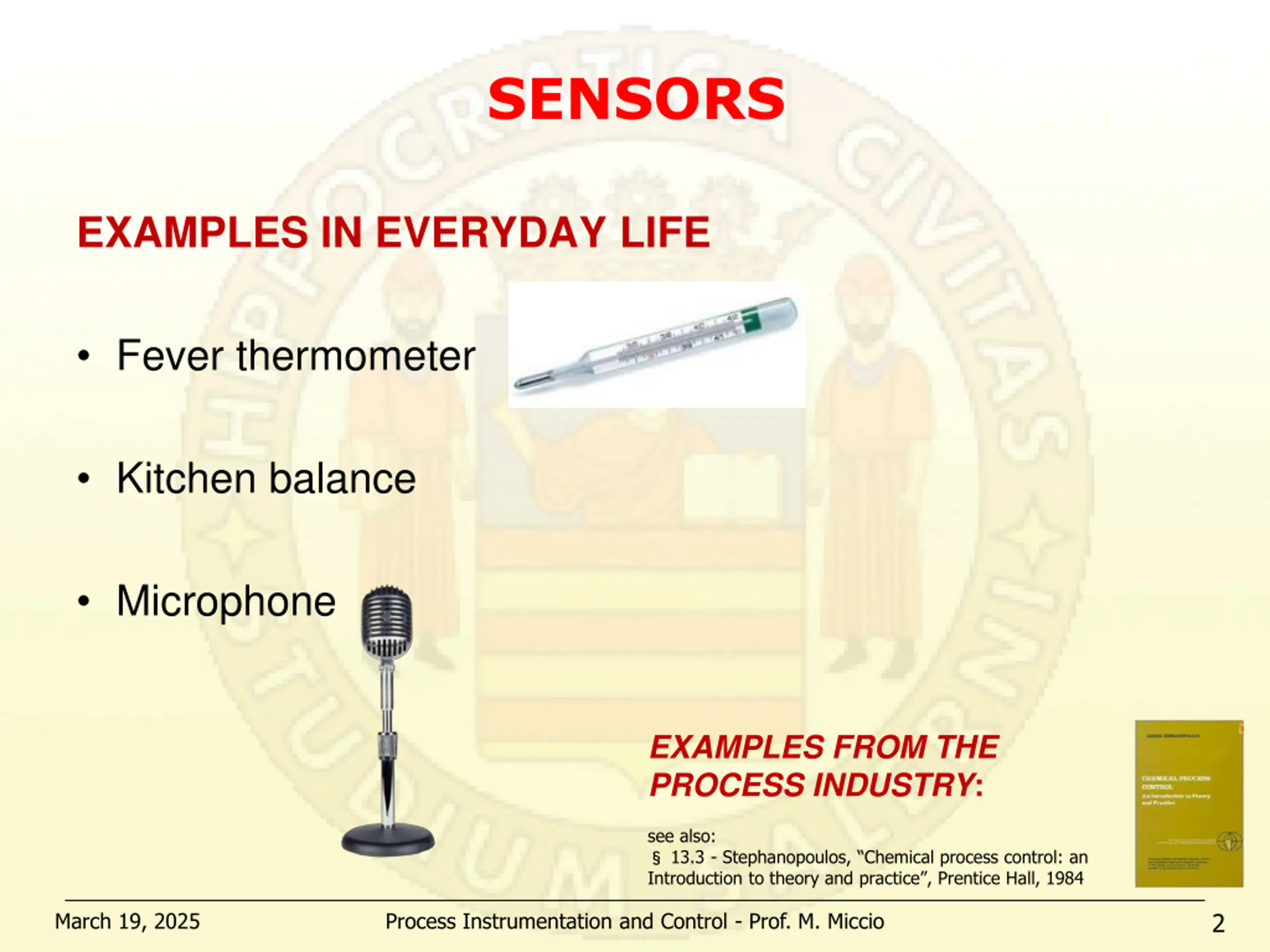 SENSORS EXAMPLES IN EVERYDAY LIFE Fever thermometer Kitchen balance Microphone EXAMPLES FROM THE PROCESS INDUSTRY: see also: 13.3 - Stephanopoulos, Chemical process control: an Introduction to theory and practice , Prentice Hall, 1984 March 19, 2025 Process Instrumentation and Control - Prof. M. Miccio 2