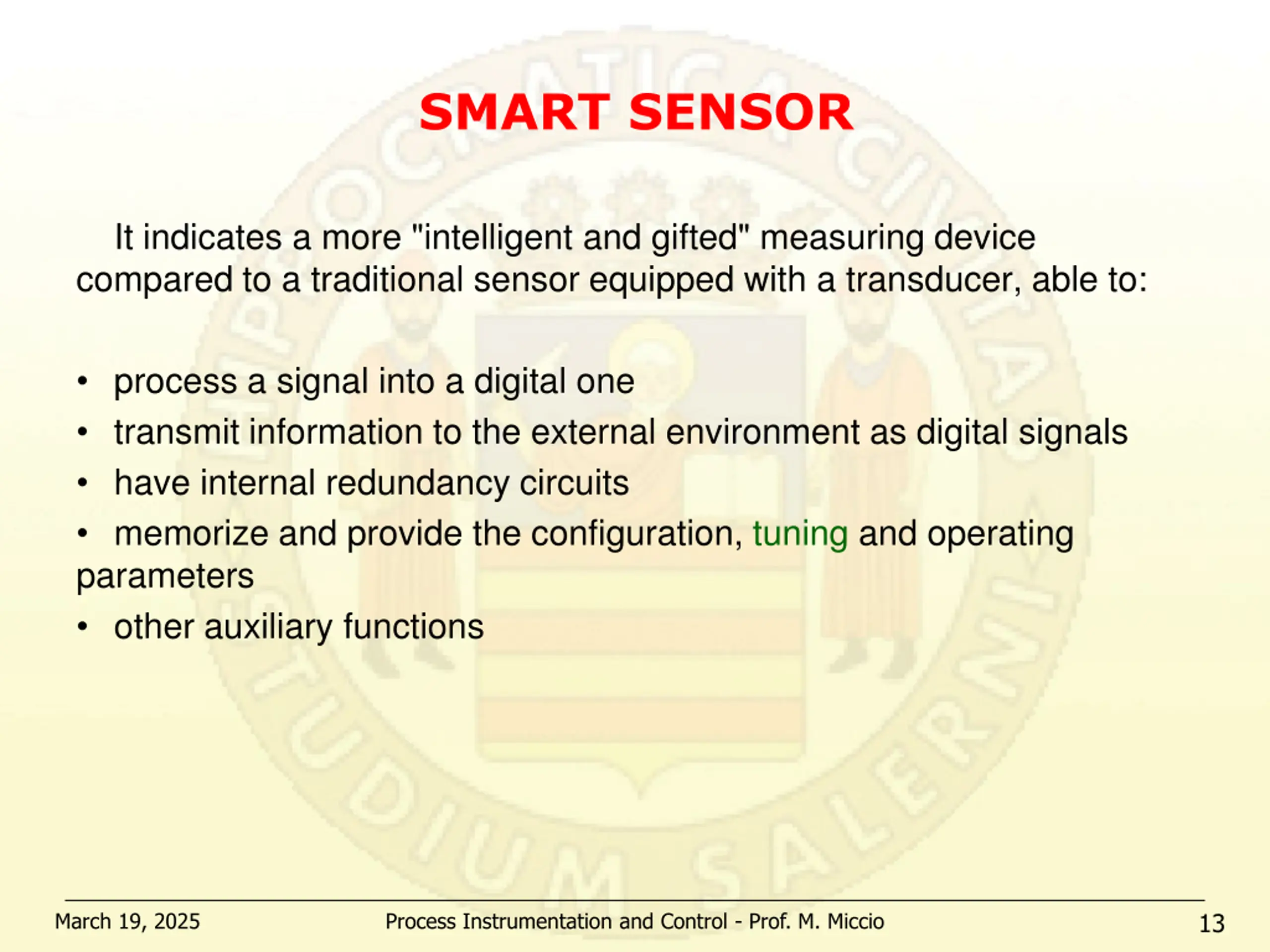 SMART SENSOR It indicates a more "intelligent and gifted" measuring device compared to a traditional sensor equipped with a transducer, able to: process a signal into a digital one transmit information to the external environment as digital signals have internal redundancy circuits memorize and provide the configuration, tuning and operating parameters other auxiliary functions March 19, 2025 Process Instrumentation and Control - Prof. M. Miccio 13