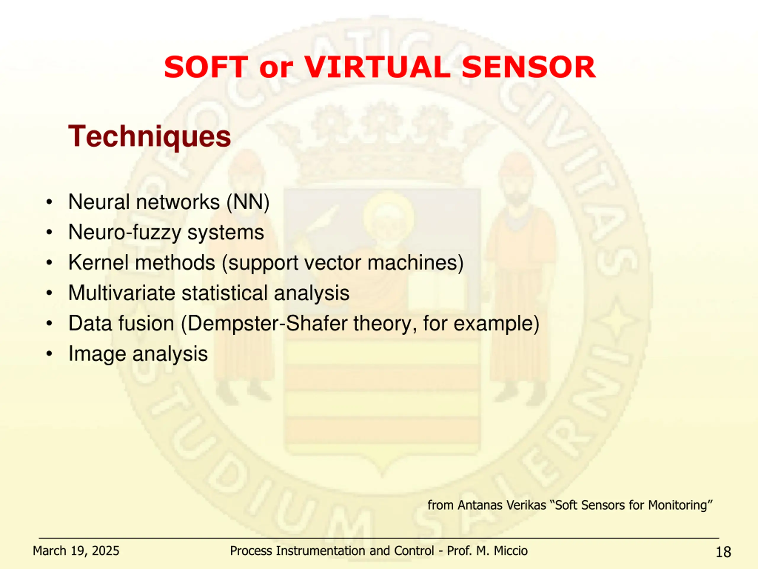 SOFT or VIRTUAL SENSOR Definitions Soft sensor is a common name for a software-implemented algorithm where several measurements are processed together. There may be dozens or even hundreds of measurements. The interaction of the measurement signals can be used for calculating new quantities that can not be measured. Soft sensors or inferential calculators are operators virtual eyes. Soft sensors create windows to a process where physical equivalents are unrealistic or even impossible. Sensor output can be a control signal, advisory information for operators, predictions of product quality, information on process faults or outliers in data, etc. from Antanas Verikas Soft Sensors for Monitoring March 19, 2025 Process Instrumentation and Control - Prof. M. Miccio 16