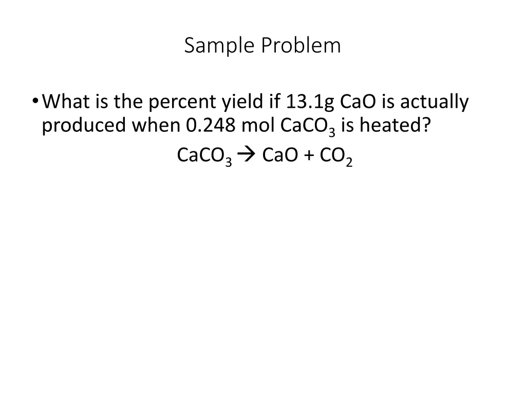 Sample Problem What is the percent yield if 13.1g CaO is actually produced when 0.248 mol CaCO3 is heated? CaCO3 CaO + CO2