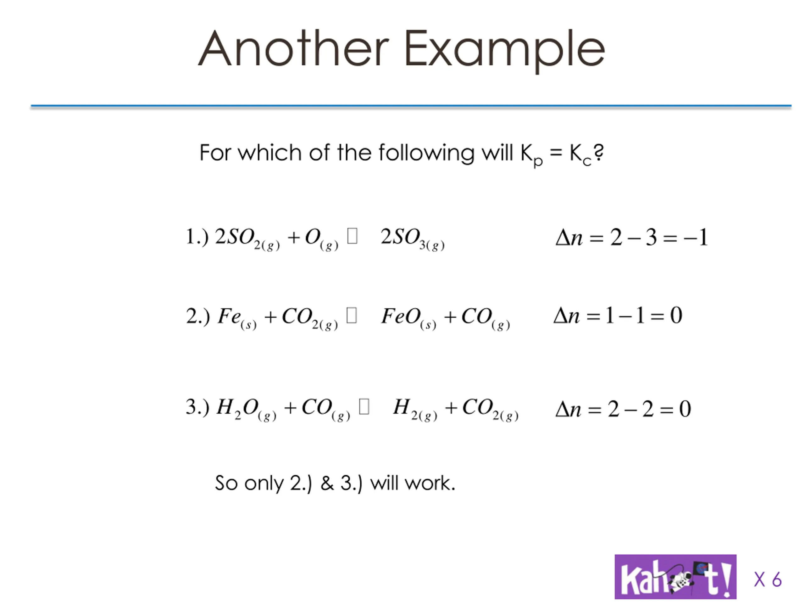 Another Example For which of the following will Kp = Kc? = = + 2 3 1 n 1.) 2 2 SO O SO 2( ) ( ) g 3( ) g g = = + + 1 1 0 n 2.) Fe CO FeO CO ( ) s 2( ) ( ) s ( ) g g + + = = 3.) H O CO H CO 2 2 0 n 2 ( ) g ( ) g 2( ) 2( ) g g So only 2.) & 3.) will work. X 6
