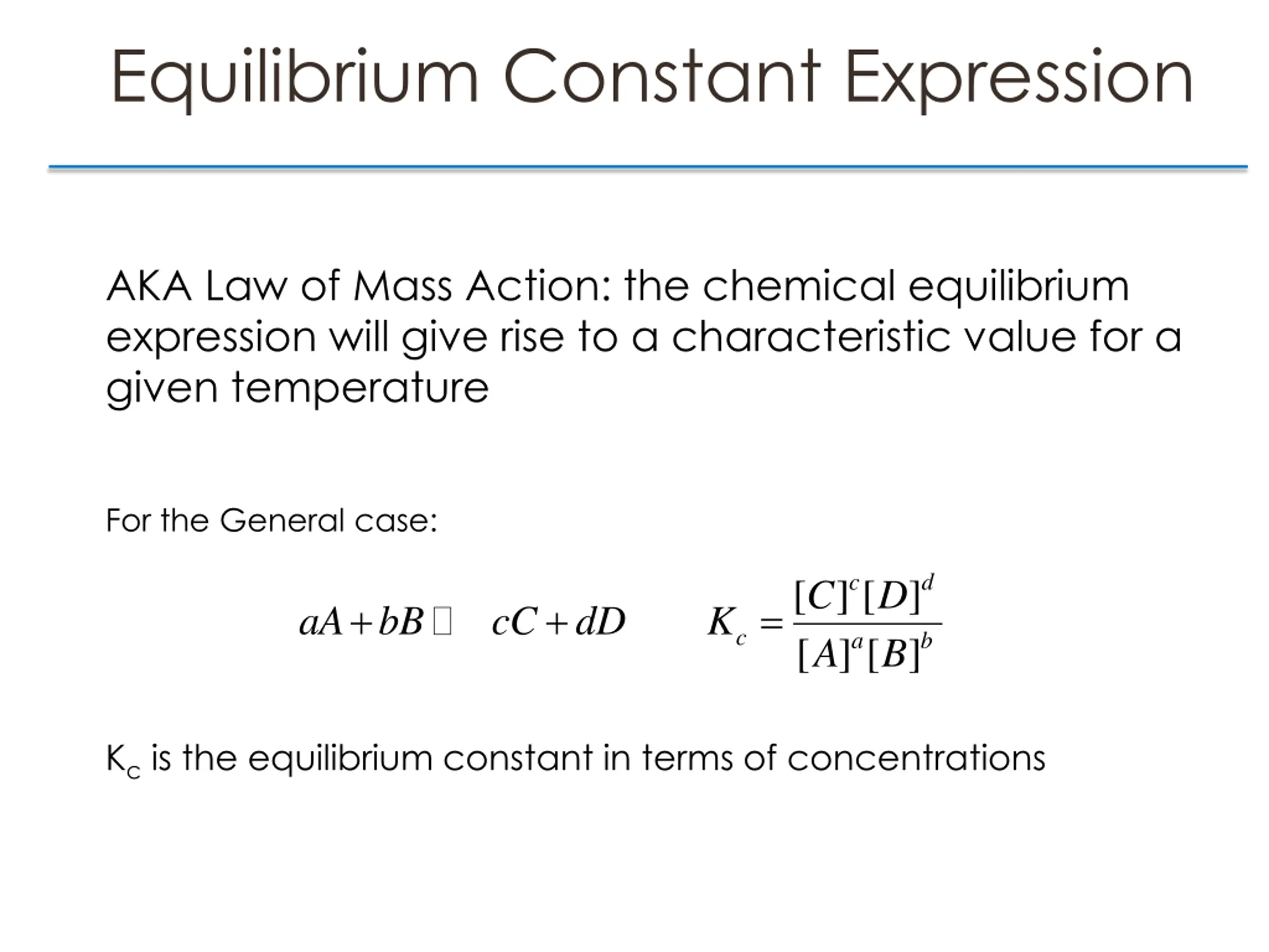 Equilibrium Constant Expression AKA Law of Mass Action: the chemical equilibrium expression will give rise to a characteristic value for a given temperature For the General case: c d [ ] [ ] [ ] [ ] A C D B aA bB + + = cC dD K c a b Kc is the equilibrium constant in terms of concentrations