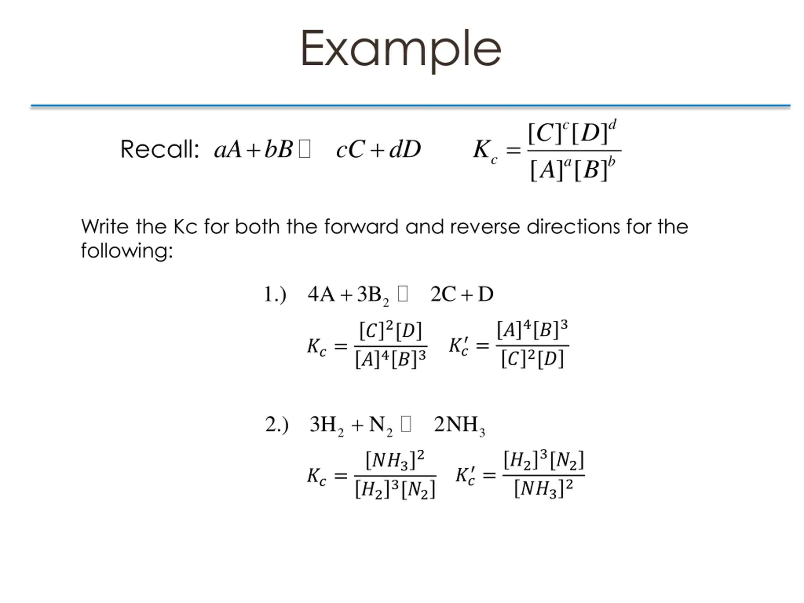 Example c d [ ] [ ] [ ] [ ] A C D B aA bB + + = Recall: cC dD K c a b Write the Kc for both the forward and reverse directions for the following: + + 1.) 4A 3B 2C D 2 ?4?3 ?2[? ?2[? ?4?3 ?? = ??= + 2.) 3H N ??3 ?23[?2 2NH 2 2 3 3[?2 2 ?2 ??32 ?? = ??=