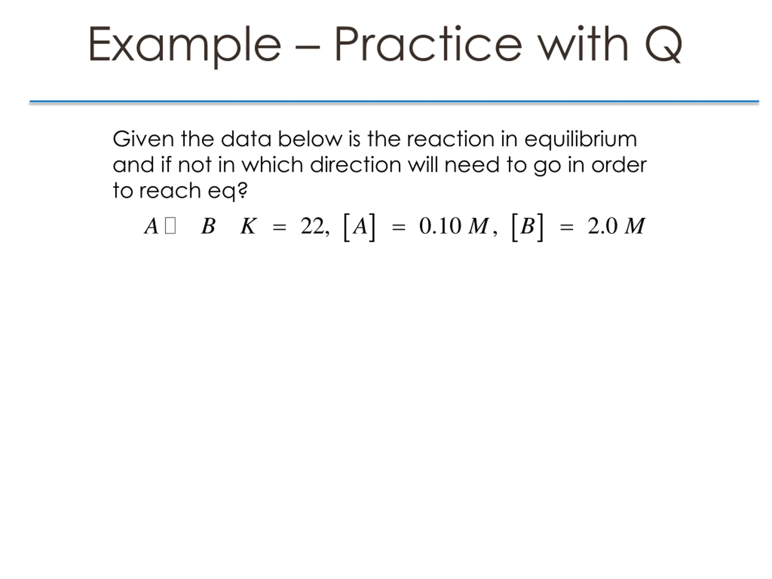 Example Practice with Q Given the data below is the reaction in equilibrium and if not in which direction will need to go in order to reach eq? 22, K A A B = B = = 0.10 , 2.0 M M
