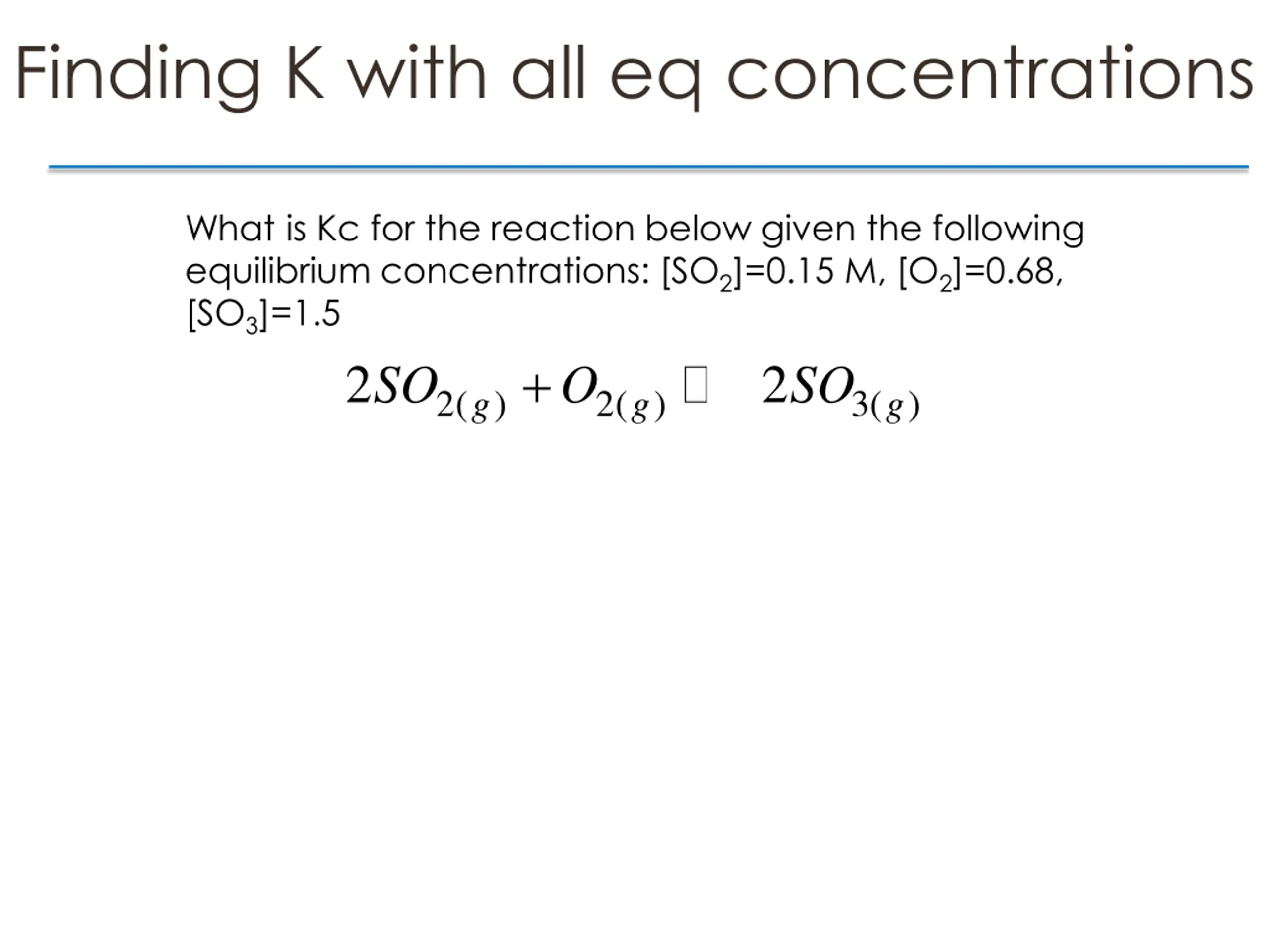 Finding K with all eq concentrations What is Kc for the reaction below given the following equilibrium concentrations: [SO2]=0.15 M, [O2]=0.68, [SO3]=1.5 + 2 2 SO O SO 2( ) 2( ) 3( ) g g g
