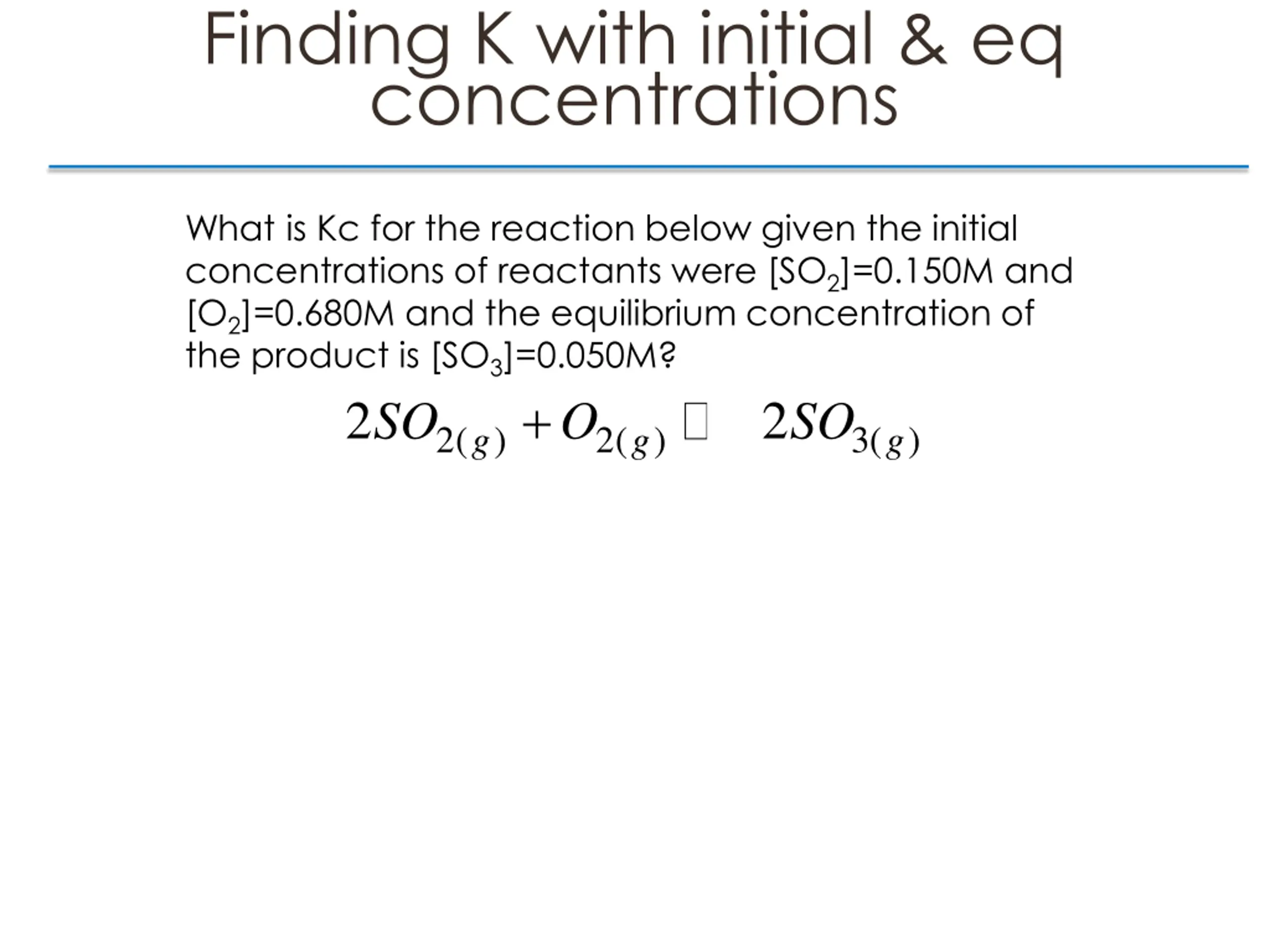 Finding K with initial & eq concentrations What is Kc for the reaction below given the initial concentrations of reactants were [SO2]=0.150M and [O2]=0.680M and the equilibrium concentration of the product is [SO3]=0.050M? 2 g g SO O + 2 SO 2( ) 2( ) 3( ) g