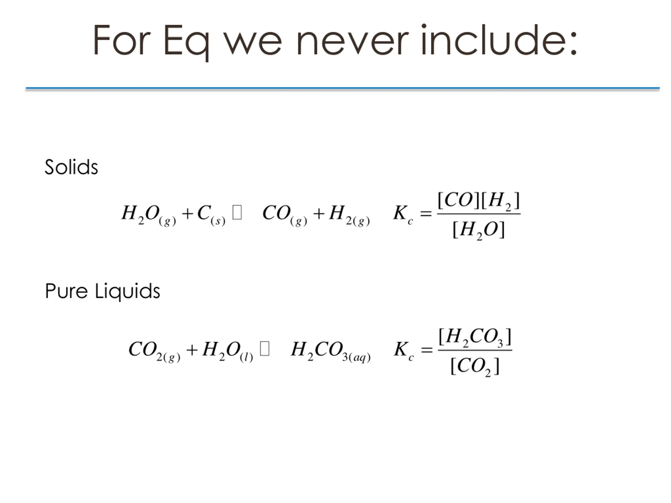 For Eq we never include: Solids [ ][ ] CO H H O + + = 2 H O C CO H K 2 ( ) g ( ) s ( ) g 2( ) g c [ ] 2 Pure Liquids [ ] H CO CO + = 2 3 CO H O H CO K 2( ) 2 ( ) l 2 3( ) g aq c [ ] 2