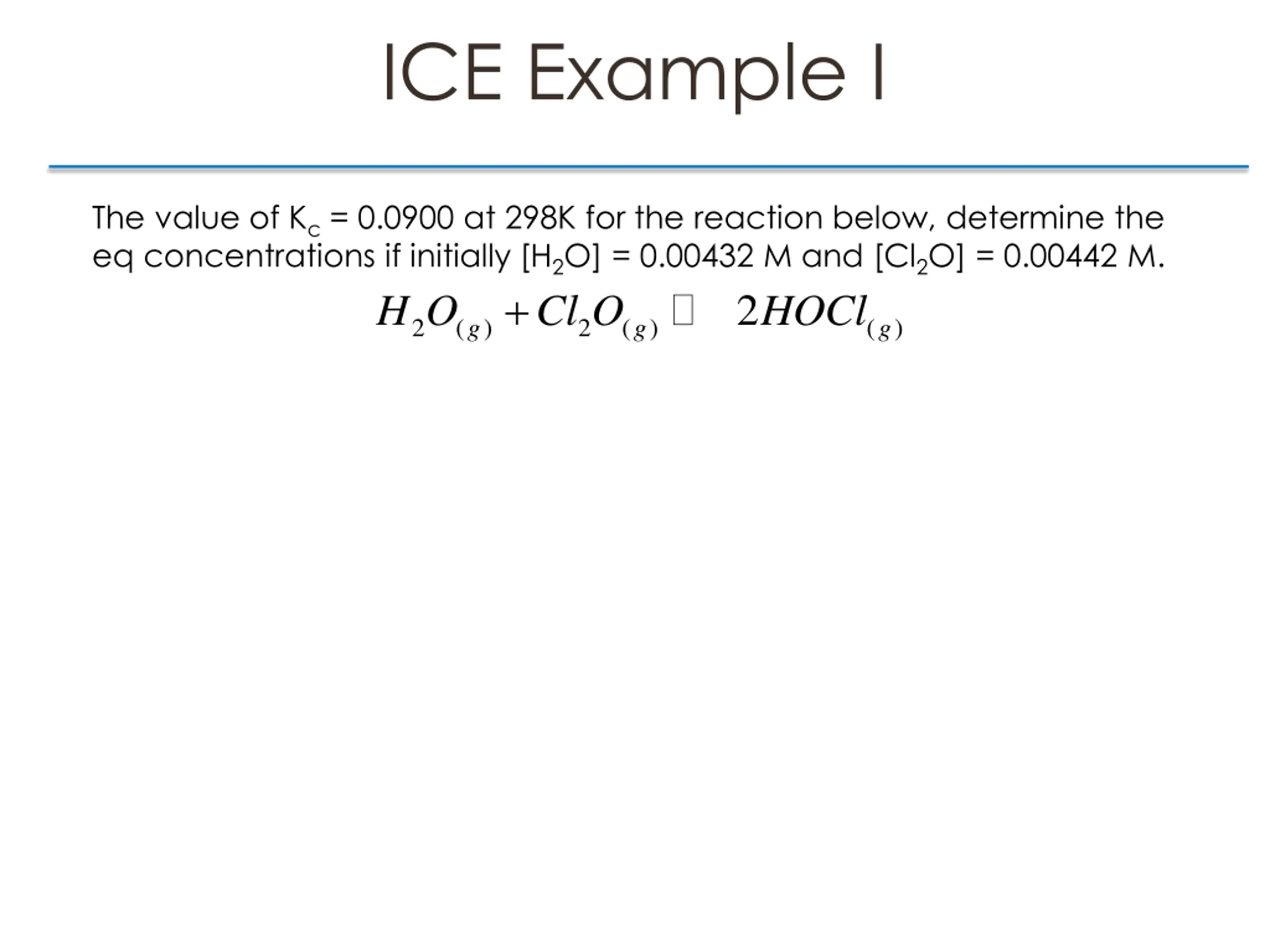 ICE Example I The value of Kc = 0.0900 at 298K for the reaction below, determine the eq concentrations if initially [H2O] = 0.00432 M and [Cl2O] = 0.00442 M. H O Cl O + 2 HOCl 2 ( ) g 2 ( ) g ( ) g