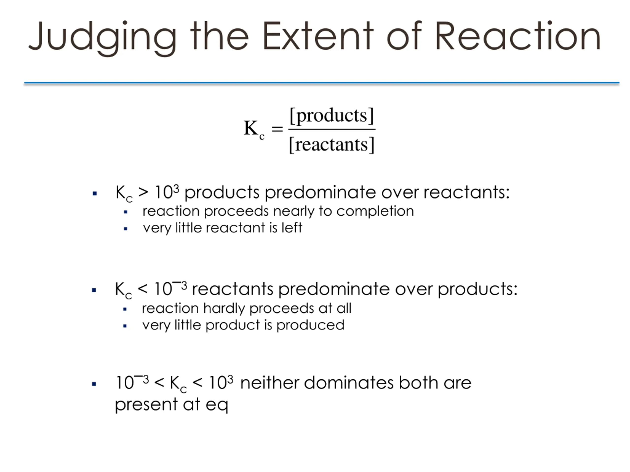 Judging the Extent of Reaction [products] [reactants] = K c Kc > 103 products predominate over reactants: reaction proceeds nearly to completion very little reactant is left Kc < 10 3 reactants predominate over products: reaction hardly proceeds at all very little product is produced 10 3 < Kc < 103 neither dominates both are present at eq