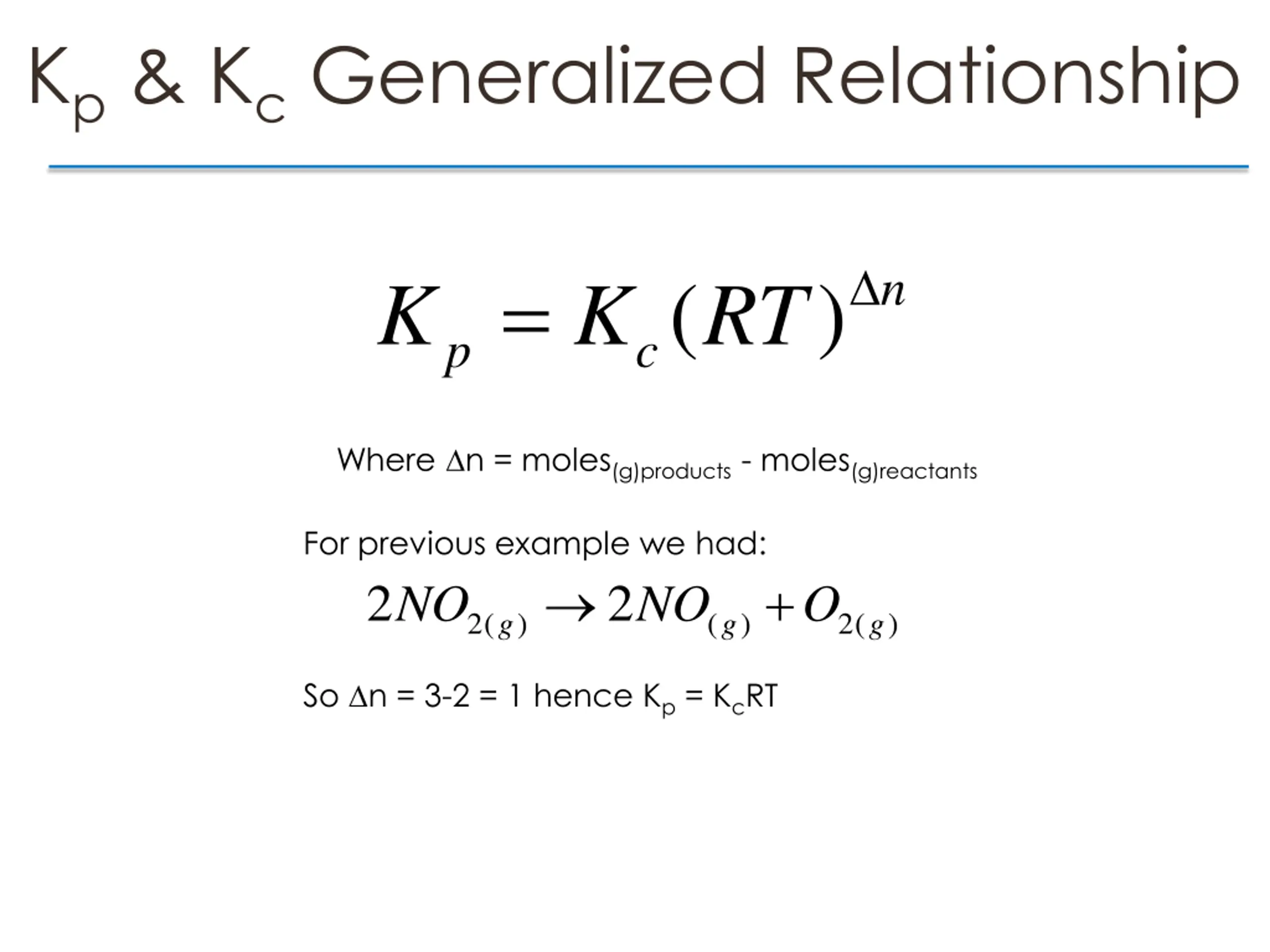 Kp & Kc Generalized Relationship = n ( ) K K RT p c Where n = moles(g)products - moles(g)reactants For previous example we had: + 2 2 NO NO O 2( ) ( ) g 2( ) g g So n = 3-2 = 1 hence Kp = KcRT