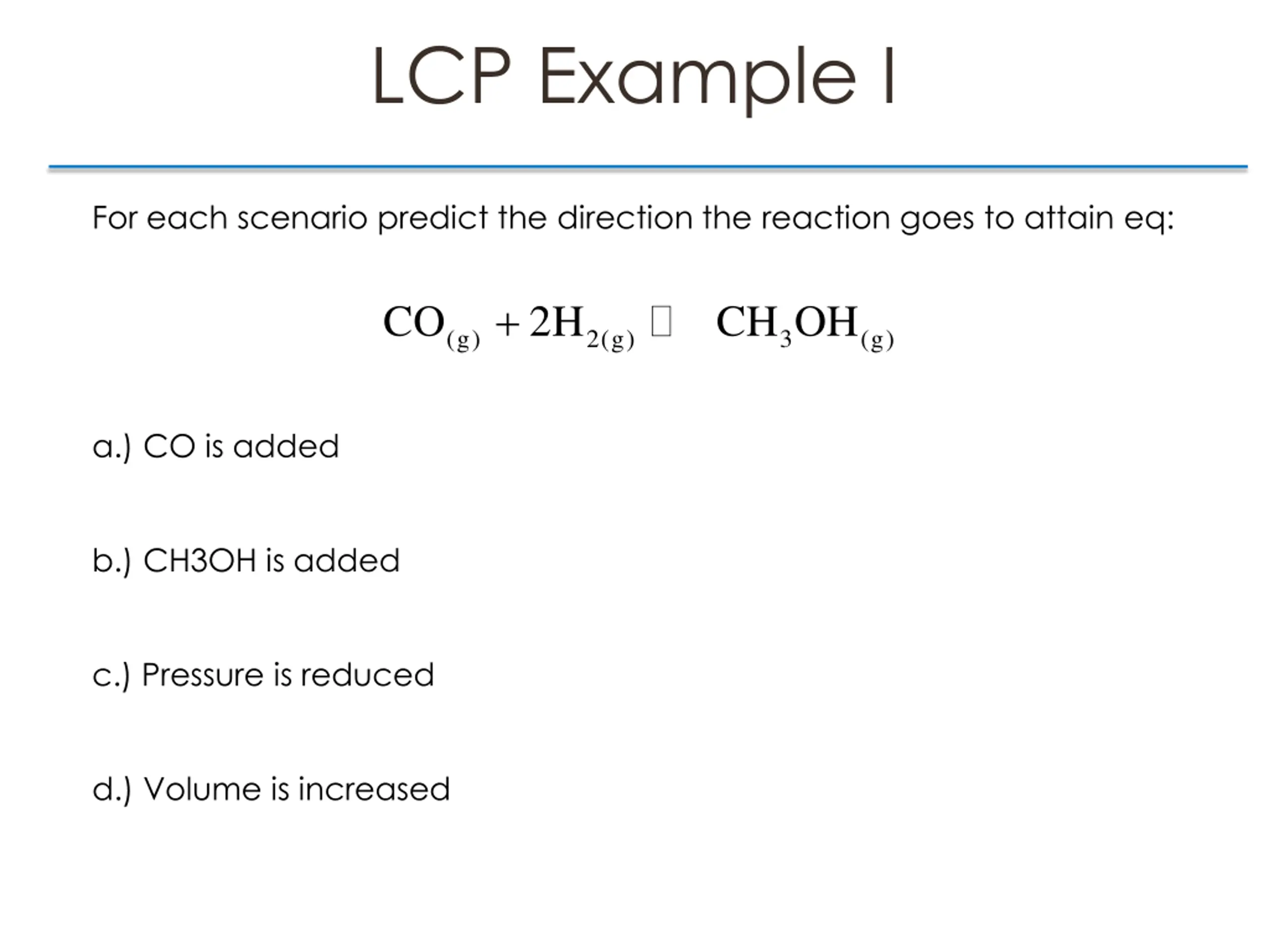 LCP Example I For each scenario predict the direction the reaction goes to attain eq: + CO 2H CH OH (g) 2(g) 3 (g) a.) CO is added b.) CH3OH is added c.) Pressure is reduced d.) Volume is increased