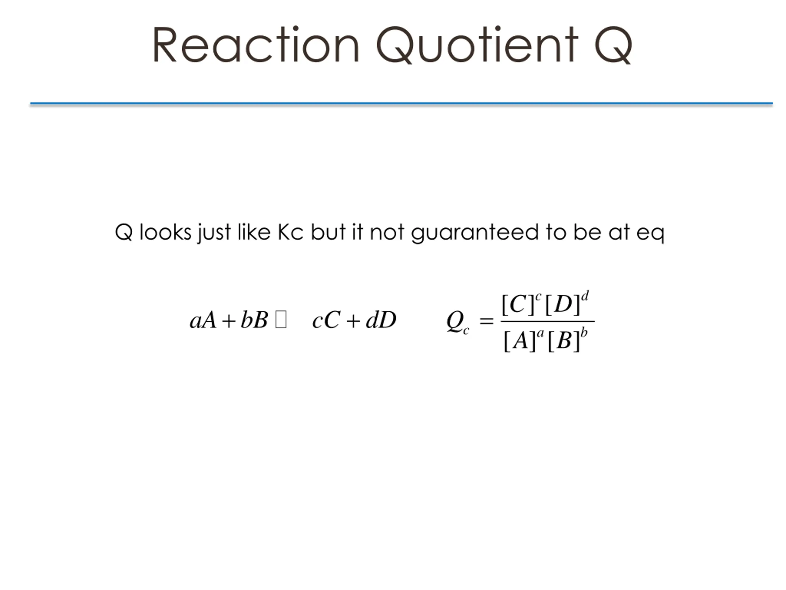 Reaction Quotient Q Q looks just like Kc but it not guaranteed to be at eq c d [ ] [ ] [ ] [ ] A C D B aA bB + + = cC dD Q c a b