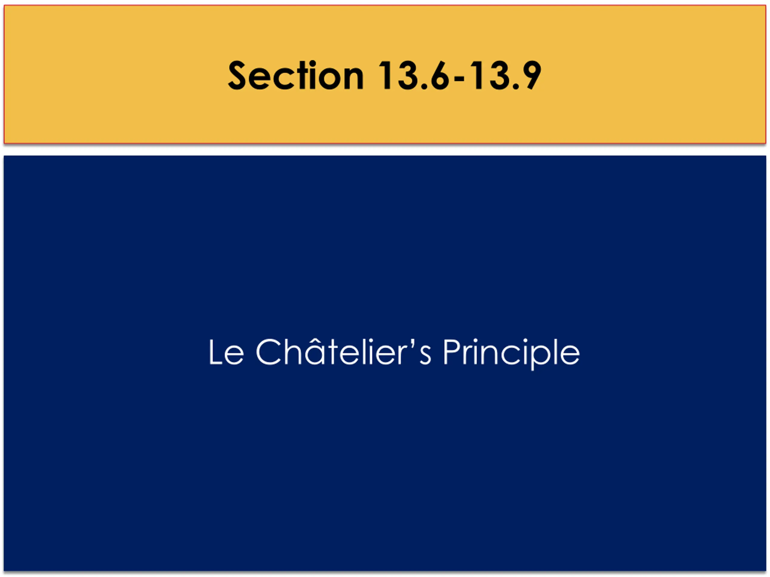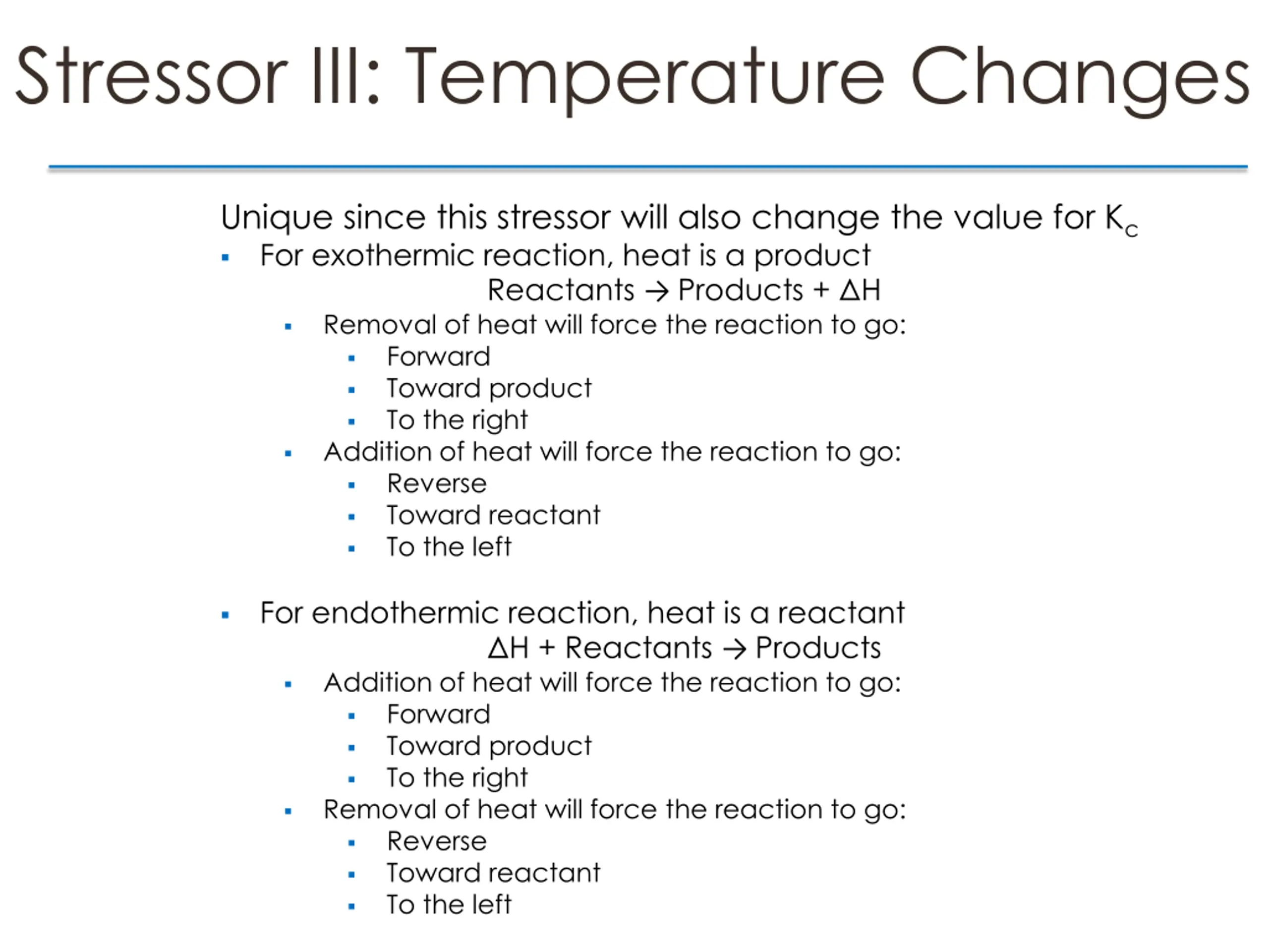 Le Chteliers Principle Defn: when a stressor is applied to a system at equilibrium, the system will adjust to counteract the stressor in order to reestablish equilibrium Stressors include: Adding or removing reactants or products Changing the pressure or the volume Changing the temperature