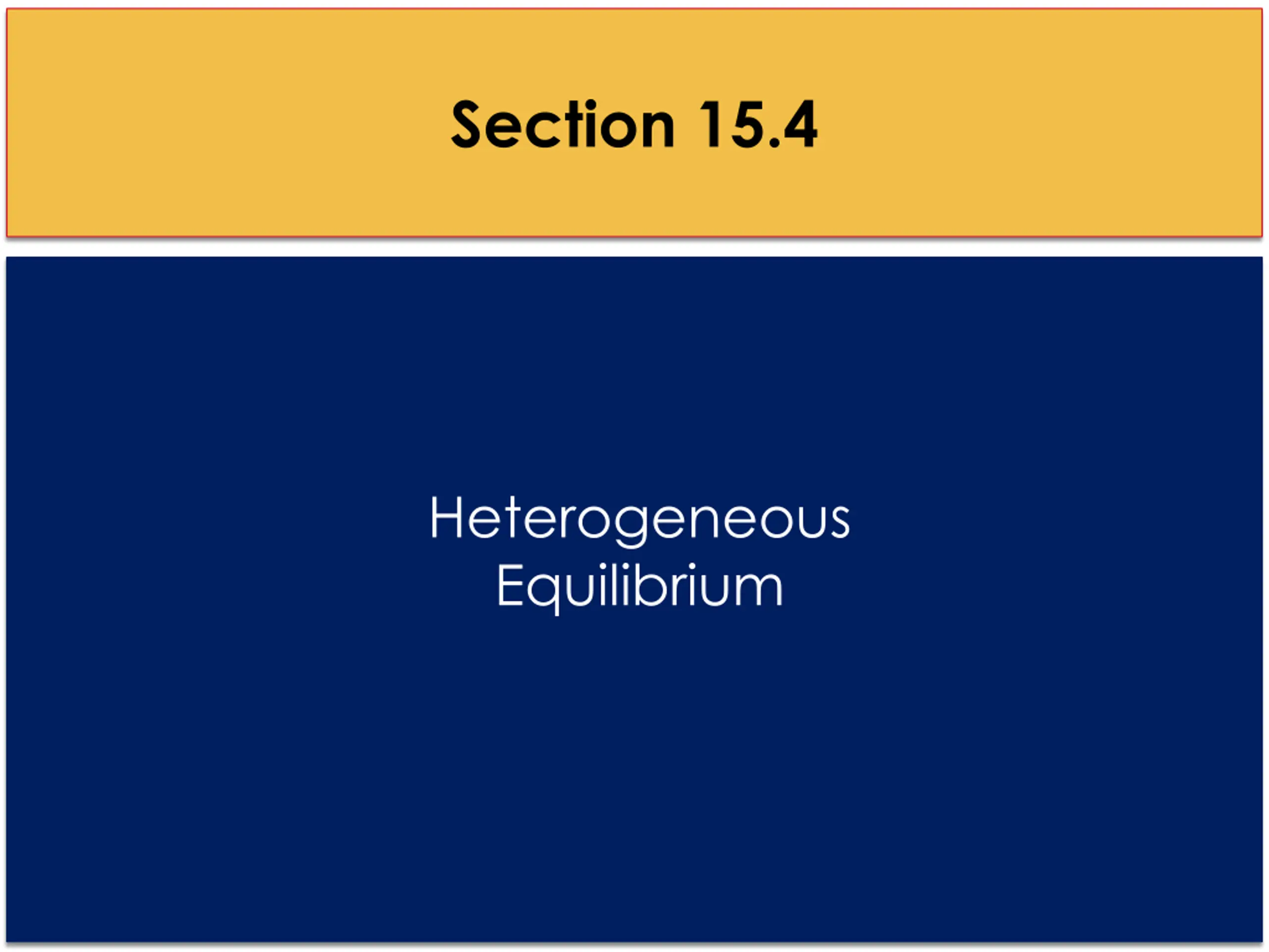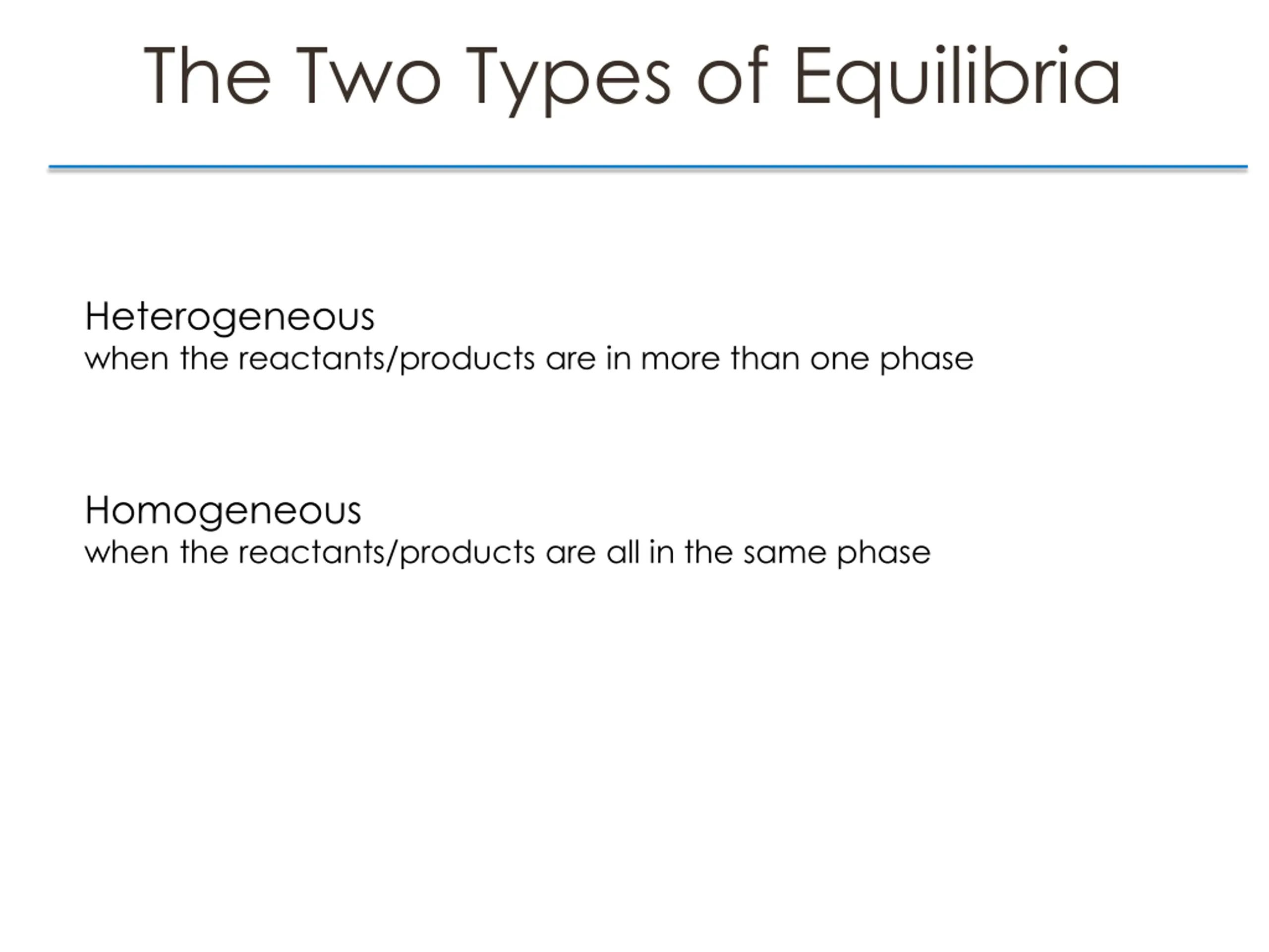 The Two Types of Equilibria Heterogeneous when the reactants/products are in more than one phase Homogeneous when the reactants/products are all in the same phase