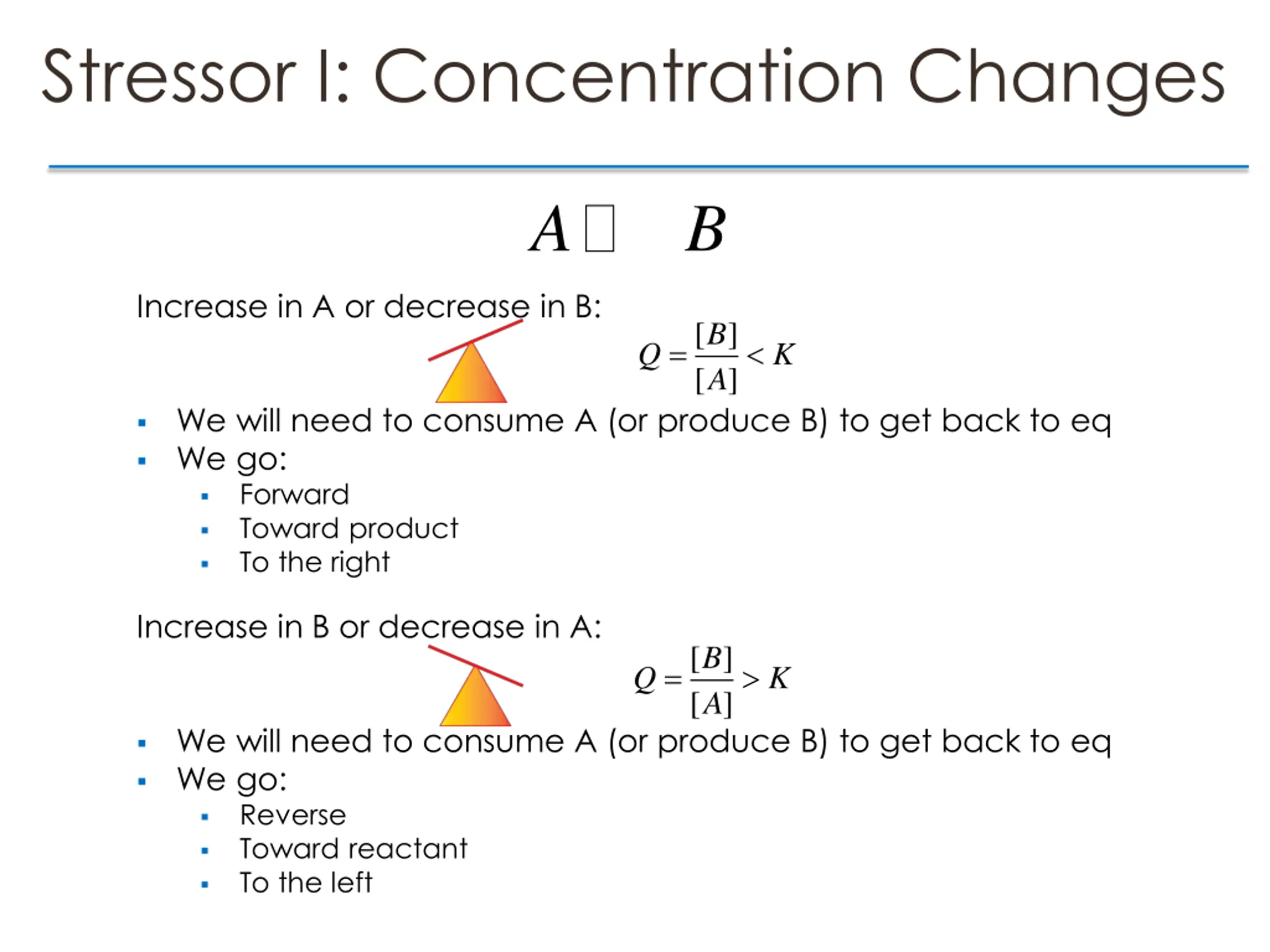 Stressor I: Concentration Changes A B Increase in A or decrease in B: [ ] [ ] A B = Q K We will need to consume A (or produce B) to get back to eq We go: Forward Toward product To the right Increase in B or decrease in A: [ ] [ ] A B = Q K We will need to consume A (or produce B) to get back to eq We go: Reverse Toward reactant To the left
