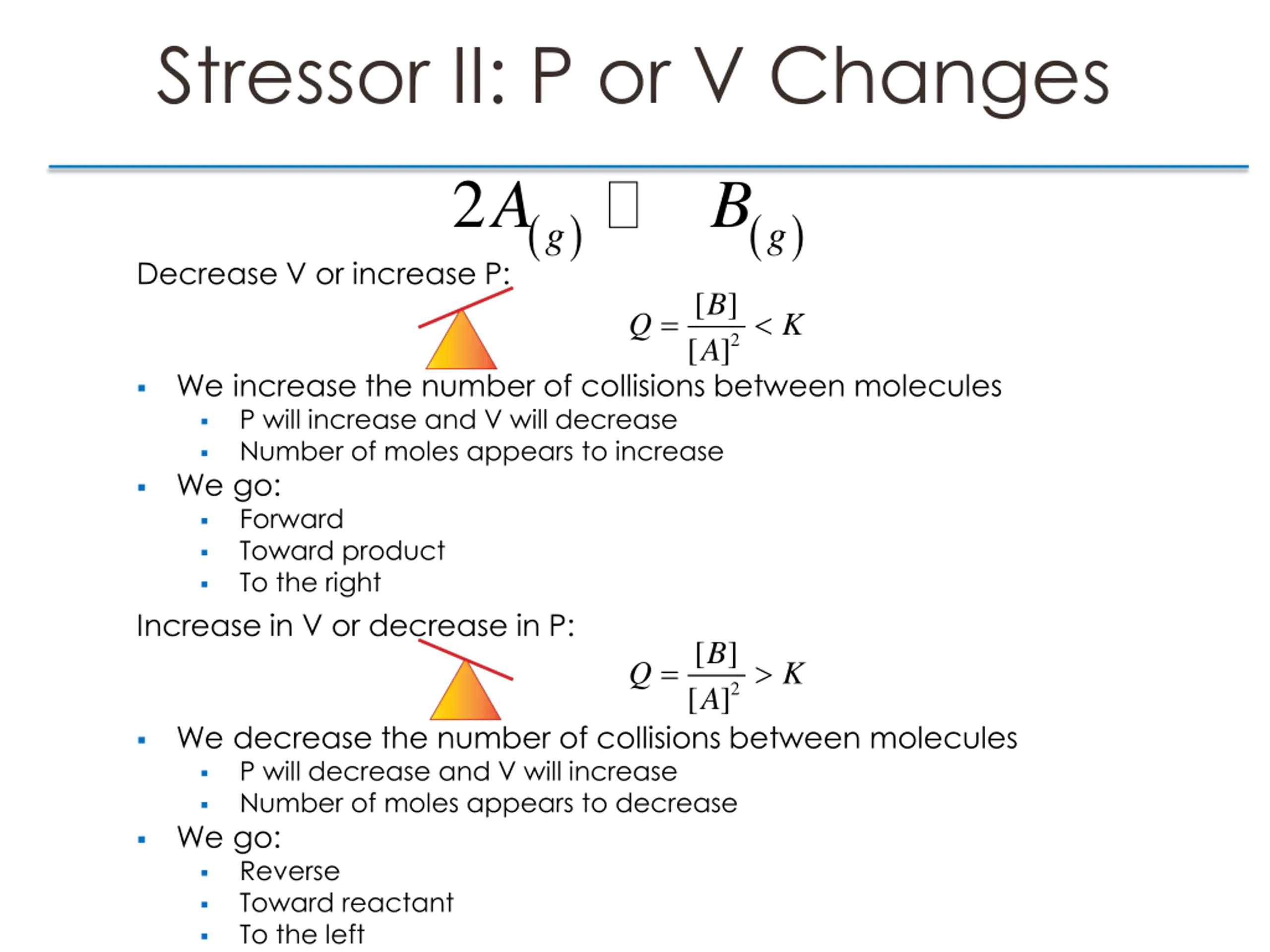 Stressor II: P or V Changes 2 A B ( ) g ( ) g Decrease V or increase P: [ ] [ ] A B = Q K 2 We increase the number of collisions between molecules P will increase and V will decrease Number of moles appears to increase We go: Forward Toward product To the right Increase in V or decrease in P: [ ] [ ] A B = Q K 2 We decrease the number of collisions between molecules P will decrease and V will increase Number of moles appears to decrease We go: Reverse Toward reactant To the left