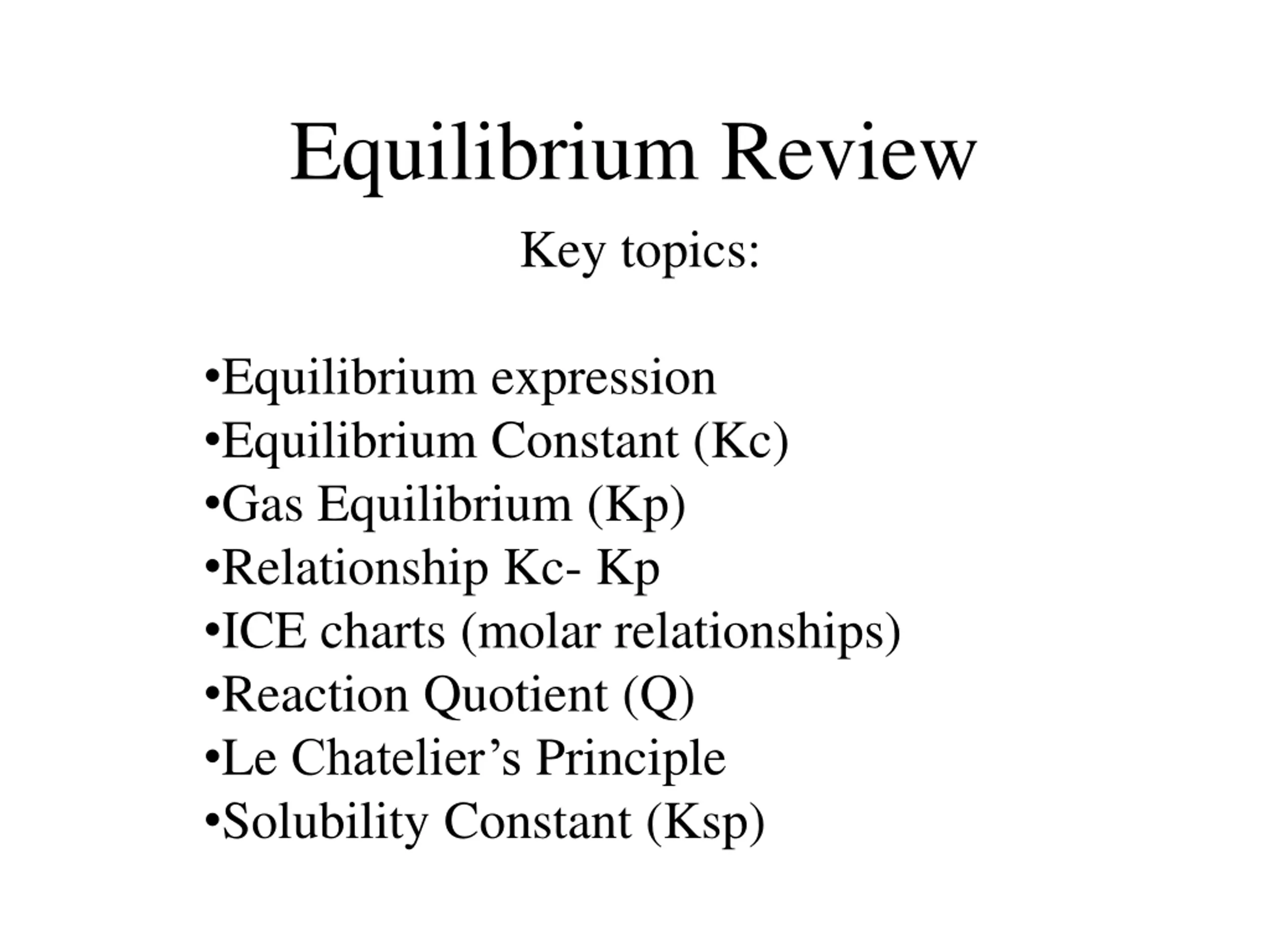 Equilibrium Review Key topics: Equilibrium expression Equilibrium Constant (Kc) Gas Equilibrium (Kp) Relationship Kc- Kp ICE charts (molar relationships) Reaction Quotient (Q) Le Chatelier s Principle Solubility Constant (Ksp)