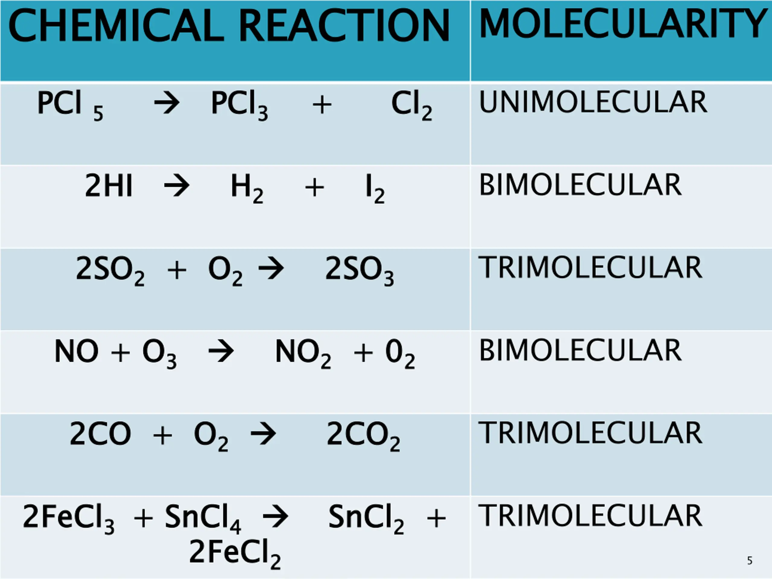 CHEMICAL REACTION CHEMICAL REACTION MOLECULARITY MOLECULARITY UNIMOLECULAR PCl 5 5 PCl PCl PCl3 + Cl + Cl2 2 3 BIMOLECULAR 2HI 2HI H H2 2 + I + I2 2 TRIMOLECULAR 2SO 2SO2 2 + O + O2 2SO 2SO3 3 2 BIMOLECULAR NO + O NO + O3 3 NO NO2 2 + 0 + 02 2 TRIMOLECULAR 2CO + O 2CO + O2 2 2CO 2CO2 2 TRIMOLECULAR 2FeCl 2FeCl3 3 + SnCl + SnCl4 4 2FeCl SnCl SnCl2 2 + + 2FeCl2 2 5