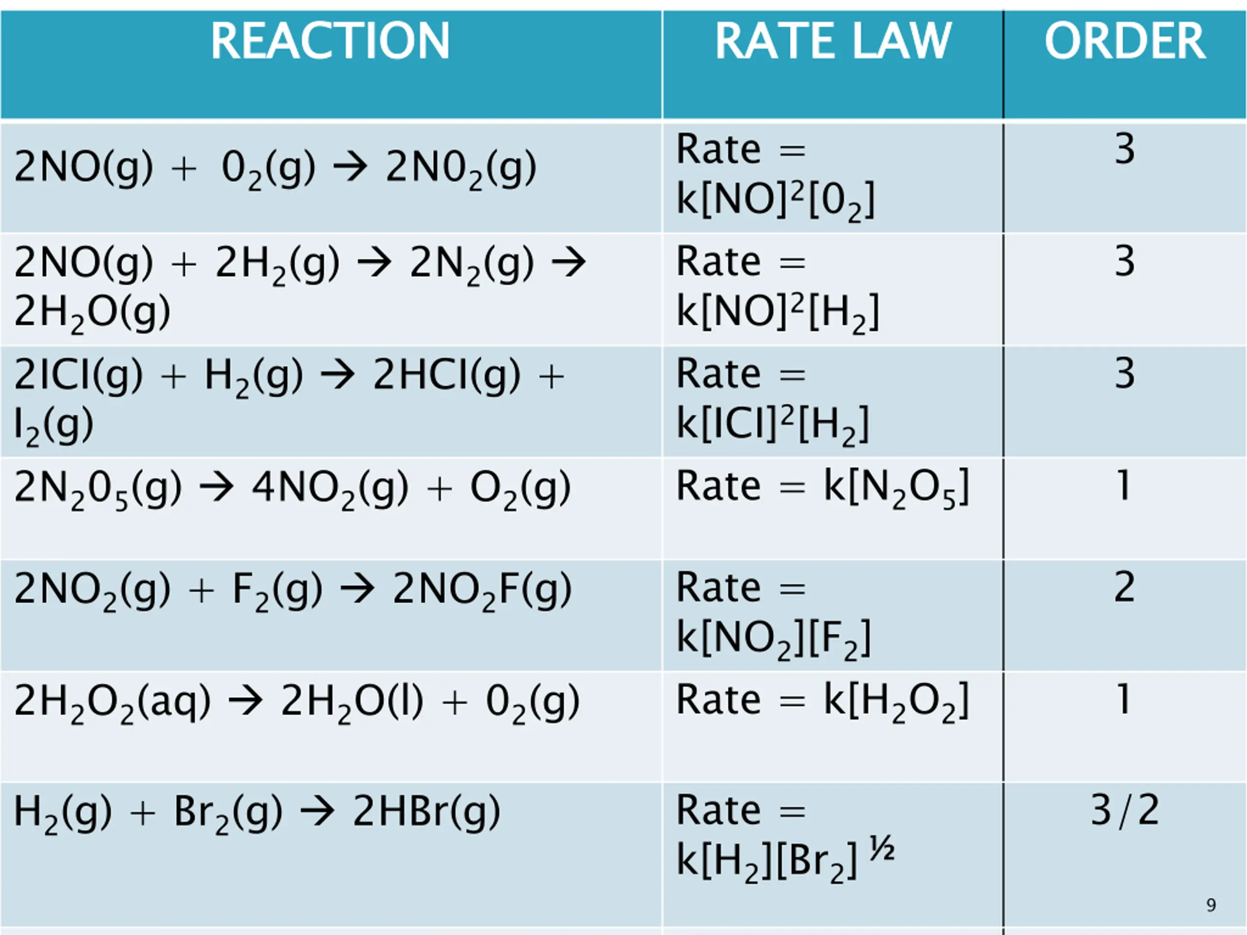 REACTION REACTION RATE RATE LAW LAW ORDER ORDER 2NO(g) +02(g) 2N02(g) Rate = k[NO]2[02] Rate = k[NO]2[H2] Rate = k[ICI]2[H2] Rate = k[N2O5] 3 3 2NO(g) + 2H2(g) 2N2(g) 2H2O(g) 2ICI(g) + H2(g) 2HCI(g) + I2(g) 2N205(g) 4NO2(g) + O2(g) 3 1 Rate = k[NO2][F2] Rate = k[H2O2] 2 2NO2(g) + F2(g) 2NO2F(g) 1 2H2O2(aq) 2H2O(l) + 02(g) Rate = k[H2][Br2] 3/2 H2(g) + Br2(g) 2HBr(g) 9
