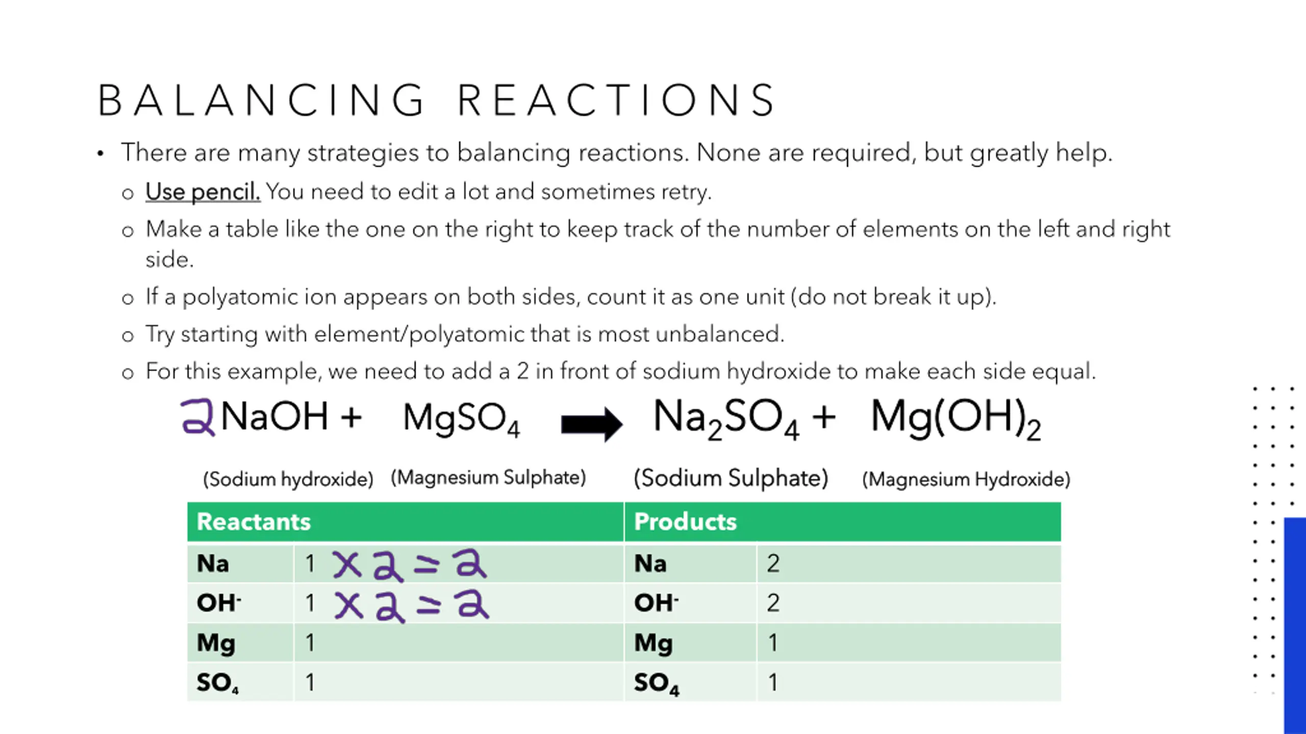 B A L A N C I N G R E AC T I O N S There are many strategies to balancing reactions. None are required, but greatly help. o Use Use pencil. pencil. You need to edit a lot and sometimes retry. o Make a table like the one on the right to keep track of the number of elements on the left and right side. o If a polyatomic ion appears on both sides, count it as one unit (do not break it up). o Try starting with element/polyatomic that is most unbalanced. o For this example, we need to add a 2 in front of sodium hydroxide to make each side equal. NaOH + NaOH + MgSO MgSO4 4 Na Na2 2SO SO4 4 + + Mg(OH) Mg(OH)2 2 (Sodium Sulphate) (Sodium Sulphate) (Magnesium Sulphate) (Magnesium Sulphate) (Sodium hydroxide) (Sodium hydroxide) (Magnesium Hydroxide) (Magnesium Hydroxide) Reactants Na OH- Mg SO4 Products Na OH- Mg SO4 1 1 1 1 2 2 1 1