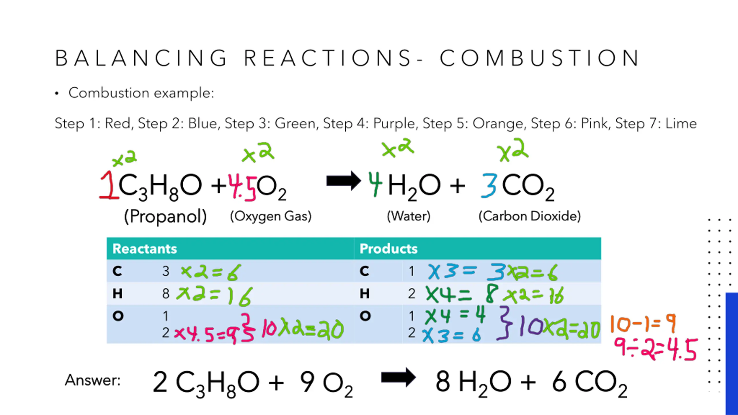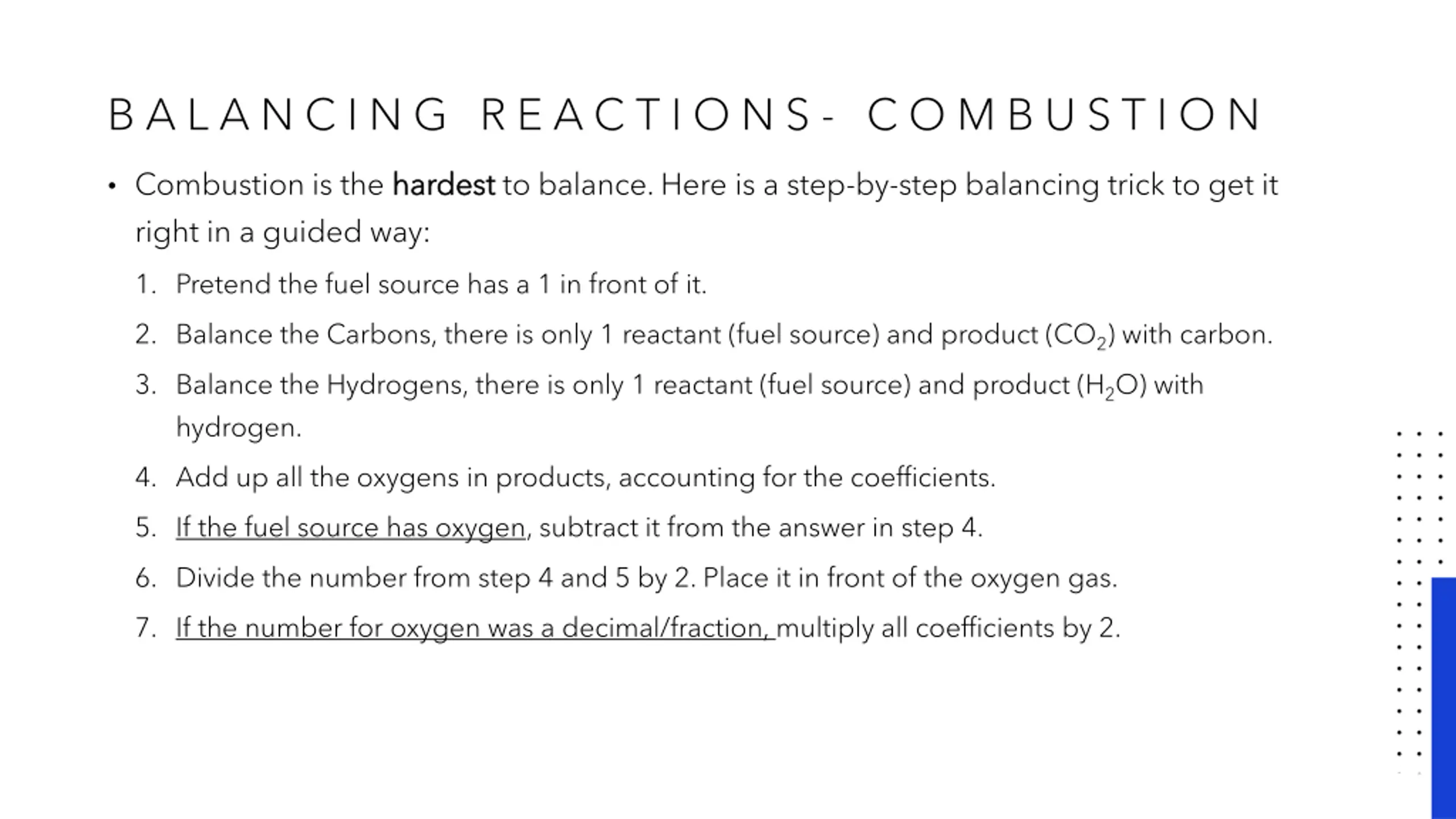 B A L A N C I N G R E A C T I O N S - C O M B U S T I O N Combustion is the hardest right in a guided way: hardest to balance. Here is a step-by-step balancing trick to get it 1. Pretend the fuel source has a 1 in front of it. 2. Balance the Carbons, there is only 1 reactant (fuel source) and product (CO2) with carbon. 3. Balance the Hydrogens, there is only 1 reactant (fuel source) and product (H2O) with hydrogen. 4. Add up all the oxygens in products, accounting for the coefficients. 5. If the fuel source has oxygen, subtract it from the answer in step 4. 6. Divide the number from step 4 and 5 by 2. Place it in front of the oxygen gas. 7. If the number for oxygen was a decimal/fraction, multiply all coefficients by 2.