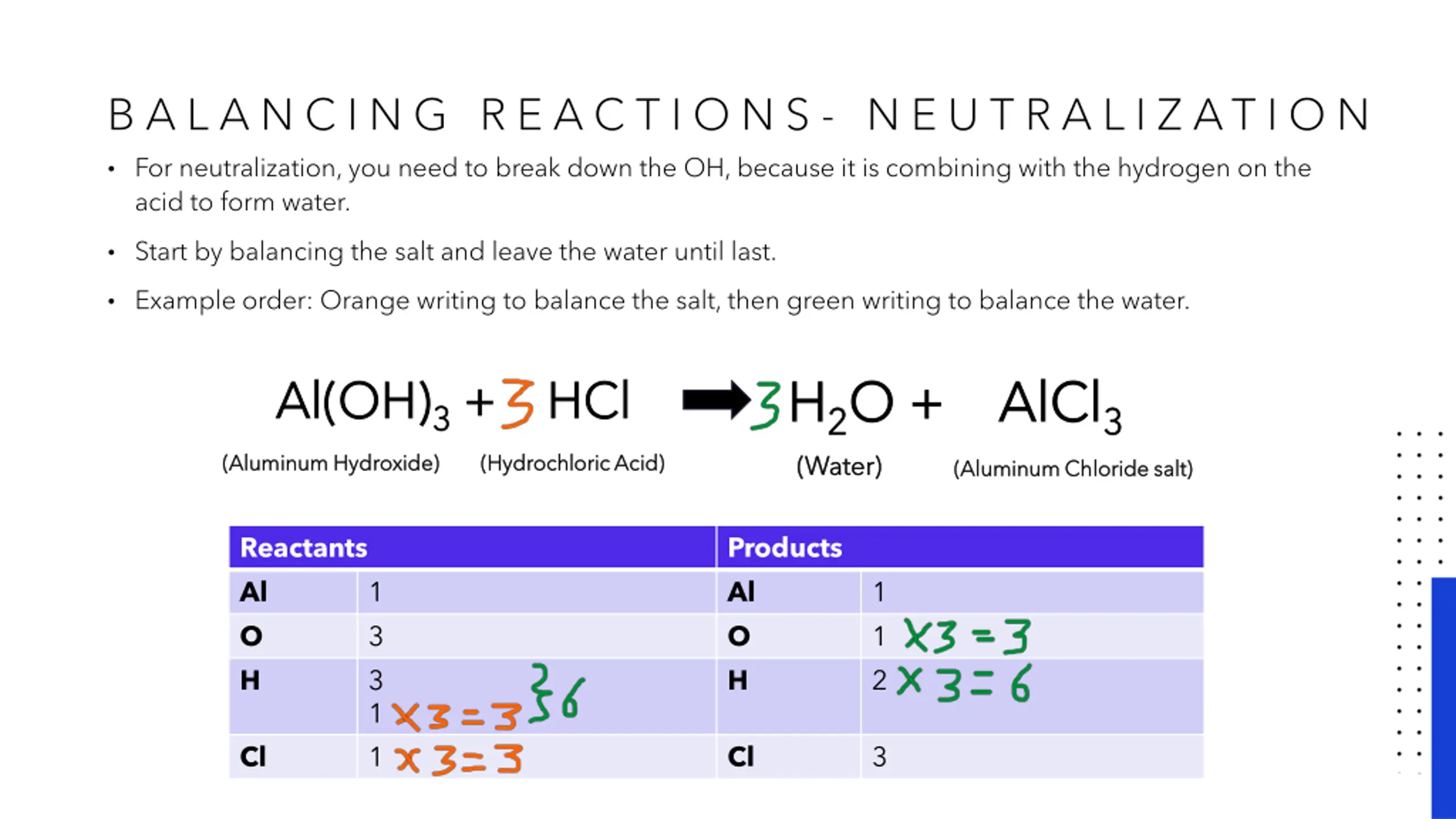 B A L A N C I N G R E A C T I O N S - N E U T R A L I Z AT I O N For neutralization, you need to break down the OH, because it is combining with the hydrogen on the acid to form water. Start by balancing the salt and leave the water until last. Example order: Orange writing to balance the salt, then green writing to balance the water. H H2 2O + O + AlCl AlCl3 3 Al(OH) Al(OH)3 3 + + HCl HCl (Water) (Water) (Aluminum Hydroxide) (Aluminum Hydroxide) (Hydrochloric Acid) (Hydrochloric Acid) (Aluminum Chloride salt) (Aluminum Chloride salt) Reactants Al O H Products Al O H 1 3 3 1 1 1 1 2 Cl Cl 3