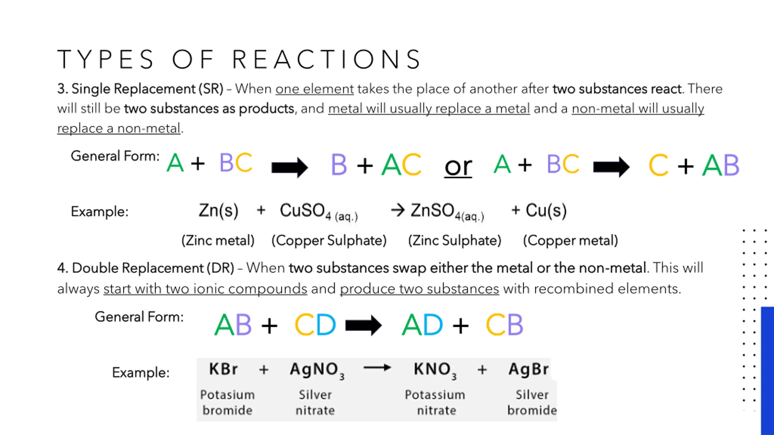 T Y P E S O F R E AC T I O N S 3. Single Replacement (SR) 3. Single Replacement (SR) When one element takes the place of another after two substances react will still be two substances as products two substances as products, and metal will usually replace a metal and a non-metal will usually replace a non-metal. A A + + B BC C B B + + A AC C two substances react. There or or A A + + B BC C General Form: General Form: C C + + A AB B Example: Example: (Zinc metal) (Zinc metal) (Copper Sulphate) (Copper Sulphate) (Zinc Sulphate) (Zinc Sulphate) (Copper metal) (Copper metal) 4. 4. Double Replacement (DR) Double Replacement (DR) When two substances swap either the metal or the non two substances swap either the metal or the non- -metal always start with two ionic compounds and produce two substances with recombined elements. A AB B + + C CD D metal. This will A AD D + + C CB B General Form: General Form: Example: Example: