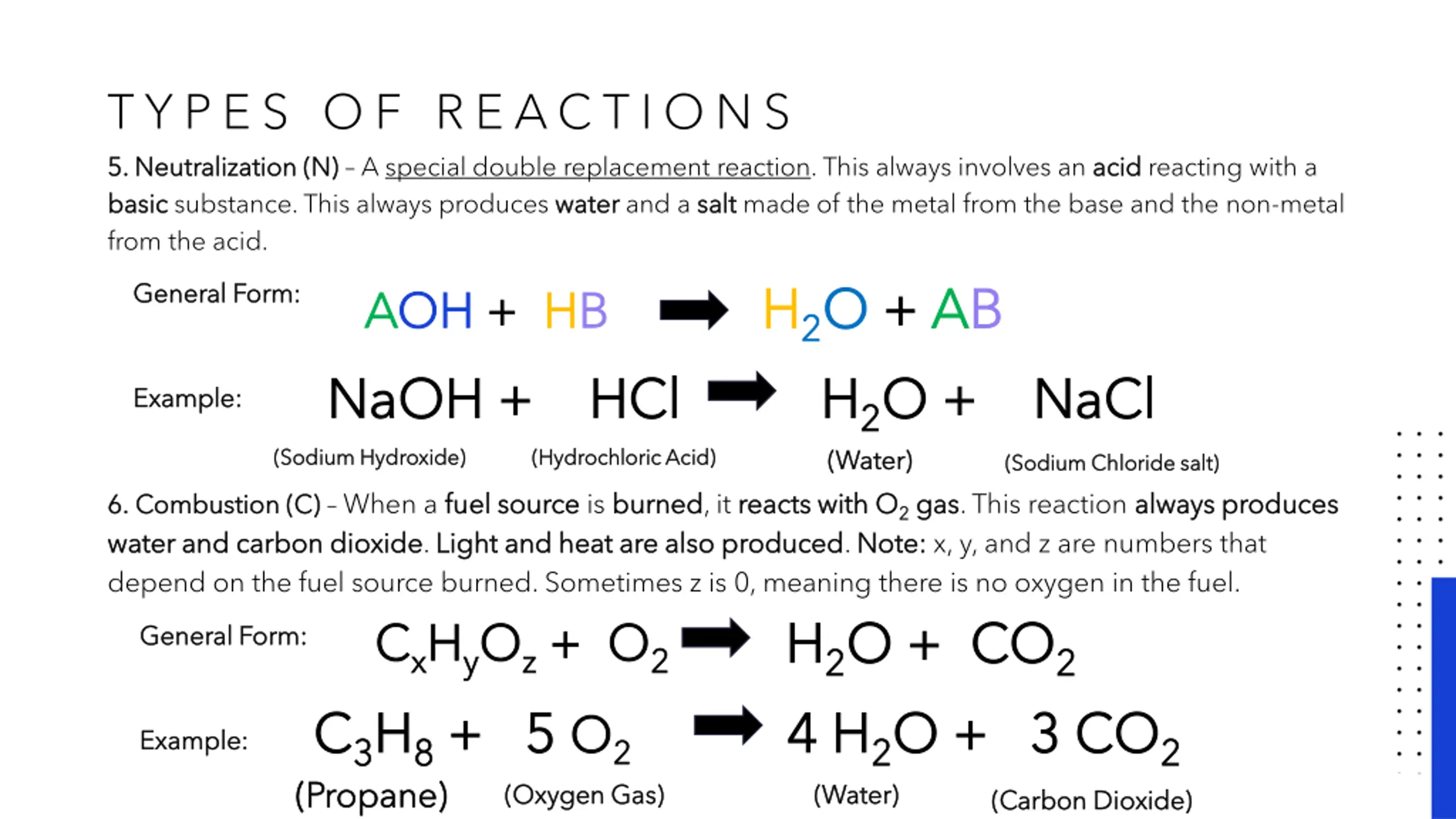 T Y P E S O F R E AC T I O N S 5. Neutralization (N) 5. Neutralization (N) A special double replacement reaction. This always involves an acid basic basic substance. This always produces water water and a salt from the acid. A AOH OH + + H HB B NaOH + NaOH + HCl HCl acid reacting with a salt made of the metal from the base and the non-metal H H2 2O O + H H2 2O + + A AB B O + NaCl General Form: General Form: NaCl Example: Example: (Water) (Water) (Sodium Hydroxide) (Sodium Hydroxide) (Hydrochloric Acid) (Hydrochloric Acid) (Sodium Chloride salt) (Sodium Chloride salt) 6. 6. Combustion (C) Combustion (C) When a fuel source water and carbon dioxide water and carbon dioxide. Light and heat are also produced Light and heat are also produced. Note: depend on the fuel source burned. Sometimes z is 0, meaning there is no oxygen in the fuel. C Cx xH Hy yO Oz z + + O O2 2 C C3 3H H8 8 + + 5 5 O O2 2 fuel source is burned burned, it reacts with O reacts with O2 2 gas gas. This reaction always produces Note: x, y, and z are numbers that always produces H H2 2O + O + CO 4 H 4 H2 2O + O + 3 CO CO2 2 General Form: General Form: 3 CO2 2 Example: Example: (Propane) (Propane) (Oxygen Gas) (Oxygen Gas) (Water) (Water) (Carbon Dioxide) (Carbon Dioxide)