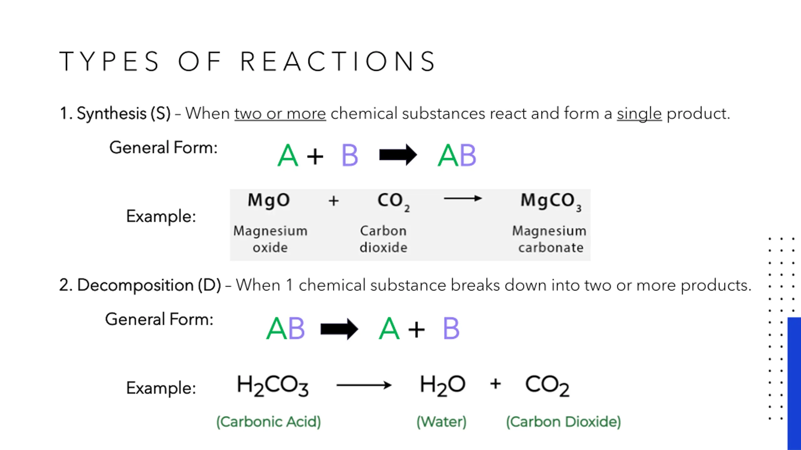 T Y P E S O F R E AC T I O N S 1. Synthesis (S) 1. Synthesis (S) When two or more chemical substances react and form a single product. A A + + B B A AB B General Form: General Form: Example: Example: 2. 2. Decomposition (D) Decomposition (D) When 1 chemical substance breaks down into two or more products. General Form: General Form: A AB B A A + + B B Example: Example:
