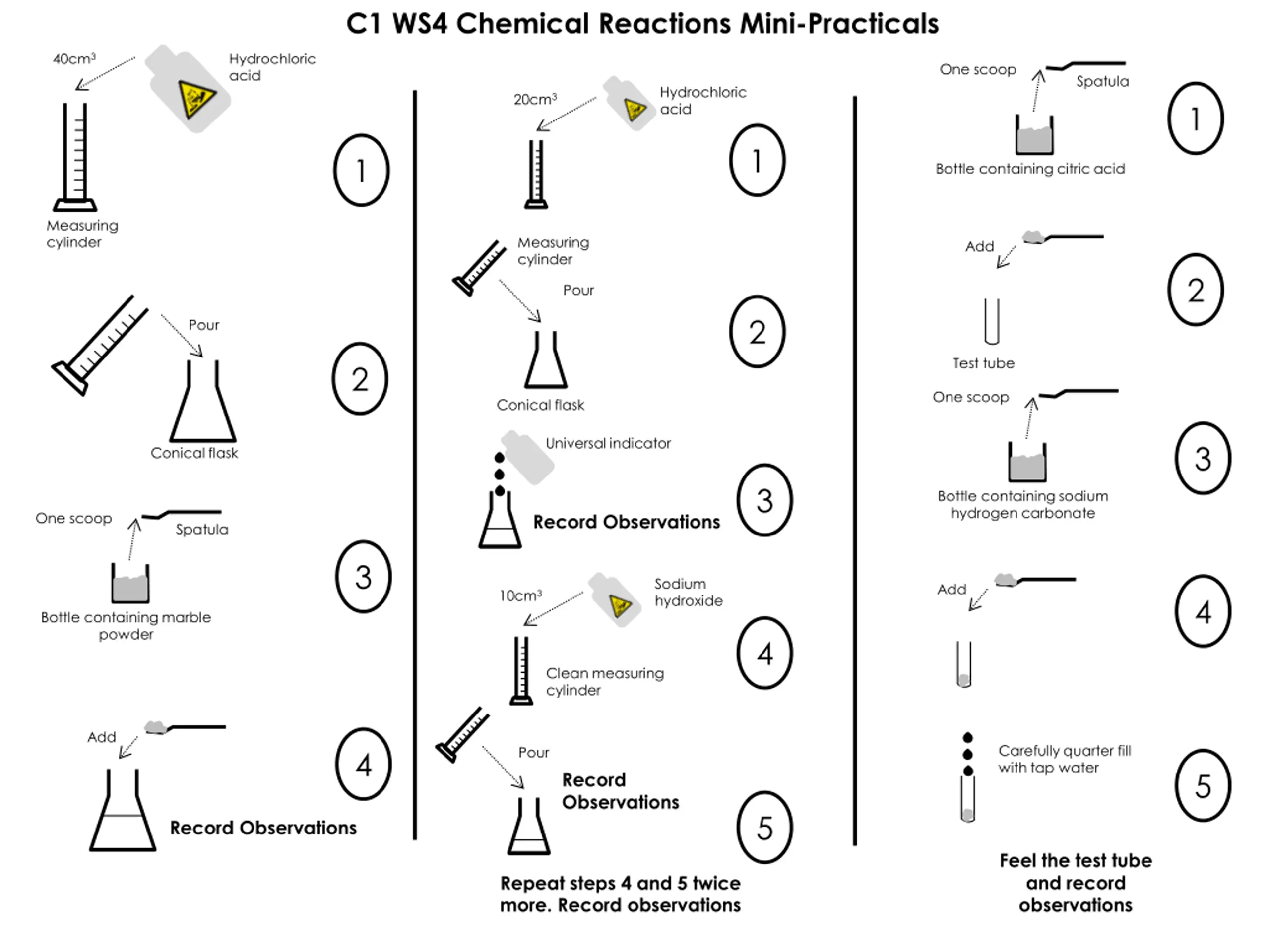 C1 WS4 Chemical Reactions Mini-Practicals 40cm3 Hydrochloric acid One scoop Spatula Hydrochloric acid 20cm3 1 1 1 Bottle containing citric acid Measuring cylinder Measuring cylinder Add 2 Pour 2 Pour Test tube 2 One scoop Conical flask Universal indicator 3 Conical flask 3 Bottle containing sodium hydrogen carbonate One scoop Record Observations Spatula 3 Sodium hydroxide Add 10cm3 4 Bottle containing marble powder 4 Clean measuring cylinder Add Carefully quarter fill with tap water Pour 4 5 Record Observations 5 Record Observations Feel the test tube and record observations Repeat steps 4 and 5 twice more. Record observations