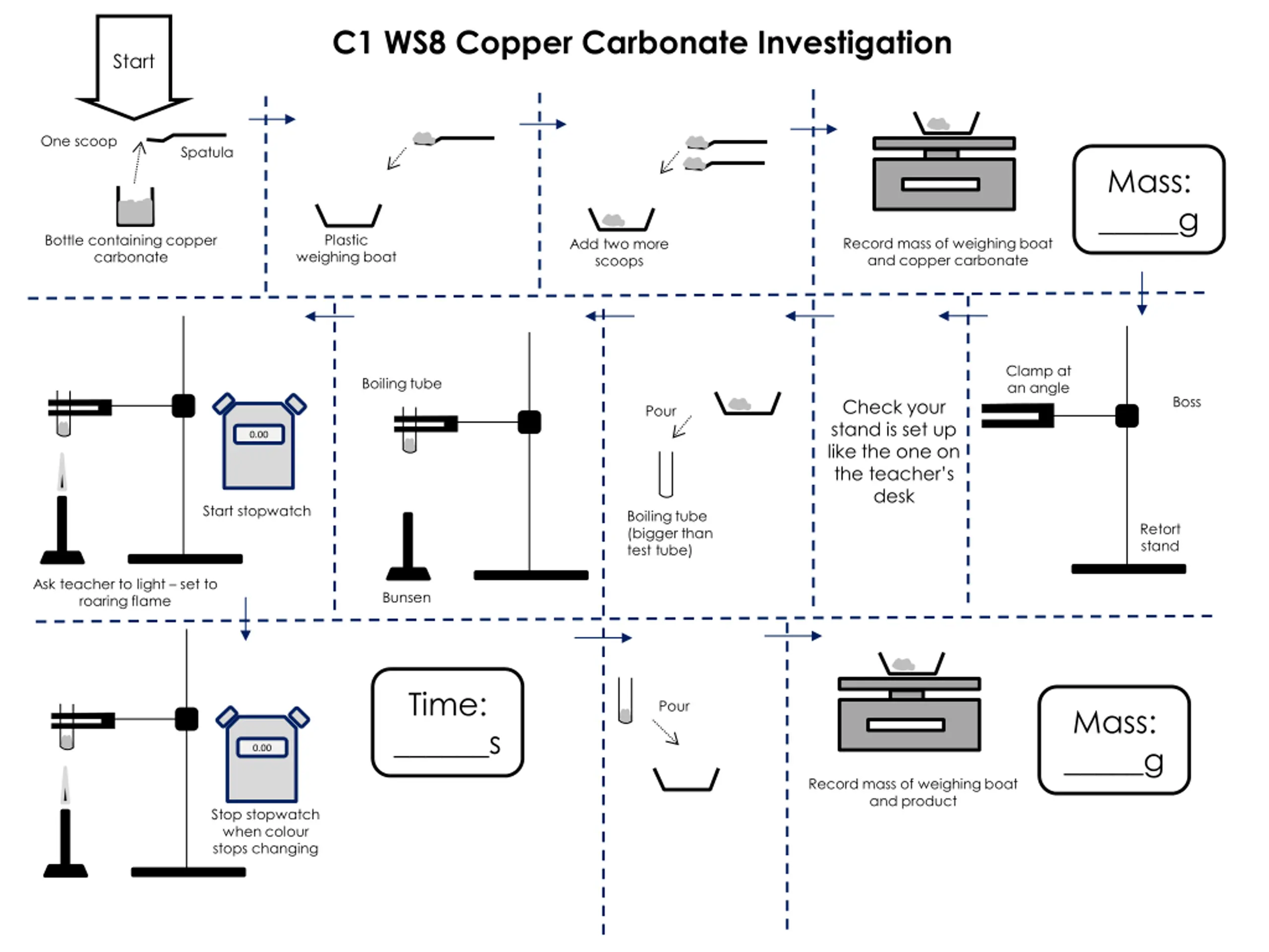 C1 WS8 Copper Carbonate Investigation Start One scoop Spatula Mass: _____g Plastic Bottle containing copper carbonate Record mass of weighing boat and copper carbonate Add two more scoops weighing boat Clamp at an angle Boiling tube Boss Check your stand is set up like the one on the teacher s desk Pour 0.00 Start stopwatch Boiling tube (bigger than test tube) Retort stand Ask teacher to light set to roaring flame Bunsen Time: ______s Pour Mass: _____g 0.00 Record mass of weighing boat and product Stop stopwatch when colour stops changing