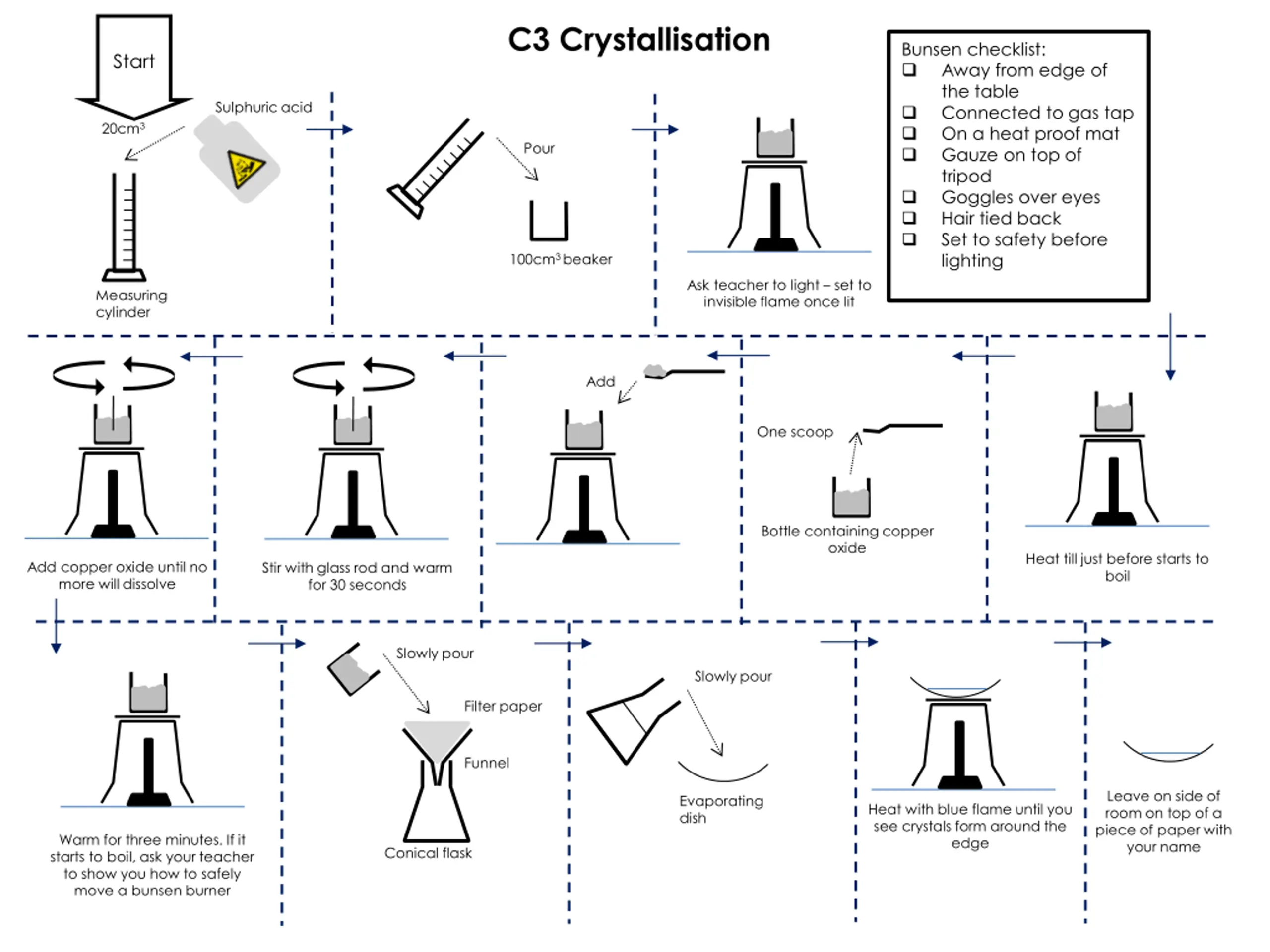 C3 Crystallisation Bunsen checklist: Away from edge of the table Connected to gas tap On a heat proof mat Gauze on top of tripod Goggles over eyes Hair tied back Set to safety before lighting Start Sulphuric acid 20cm3 Pour 100cm3 beaker Ask teacher to light set to invisible flame once lit Measuring cylinder Add One scoop Bottle containing copper oxide Heat till just before starts to boil Add copper oxide until no more will dissolve Stir with glass rod and warm for 30 seconds Slowly pour Slowly pour Filter paper Funnel Leave on side of room on top of a piece of paper with your name Evaporating dish Heat with blue flame until you see crystals form around the edge Warm for three minutes. If it starts to boil, ask your teacher to show you how to safely move a bunsen burner Conical flask