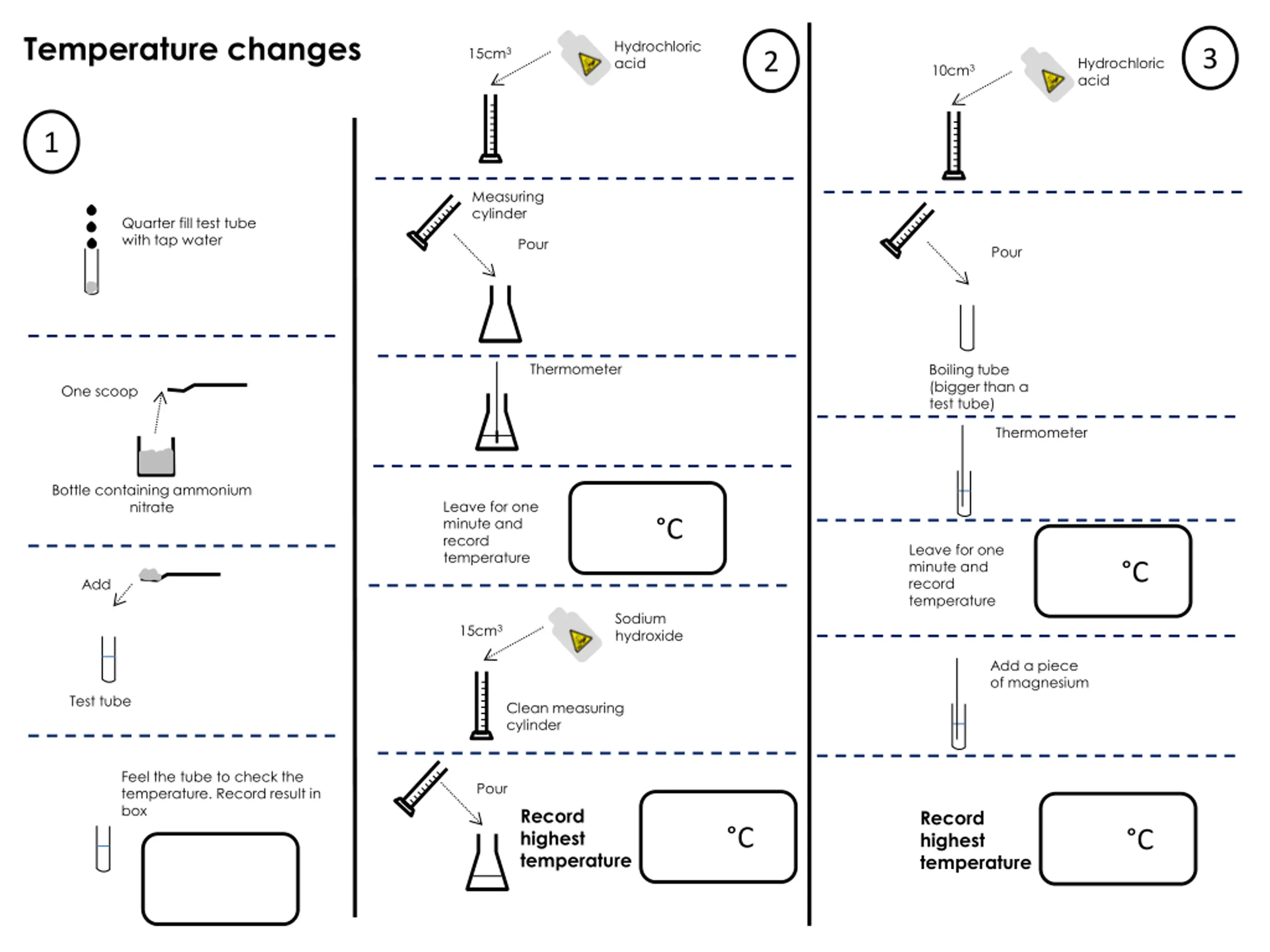 Temperature changes Hydrochloric acid 15cm3 3 2 Hydrochloric acid 10cm3 1 Measuring cylinder Quarter fill test tube with tap water Pour Pour Thermometer Boiling tube (bigger than a test tube) One scoop Thermometer Bottle containing ammonium nitrate Leave for one minute and record temperature C Leave for one minute and record temperature C Add Sodium hydroxide 15cm3 Add a piece of magnesium Test tube Clean measuring cylinder Feel the tube to check the temperature. Record result in box Pour Record highest temperature Record highest temperature C C