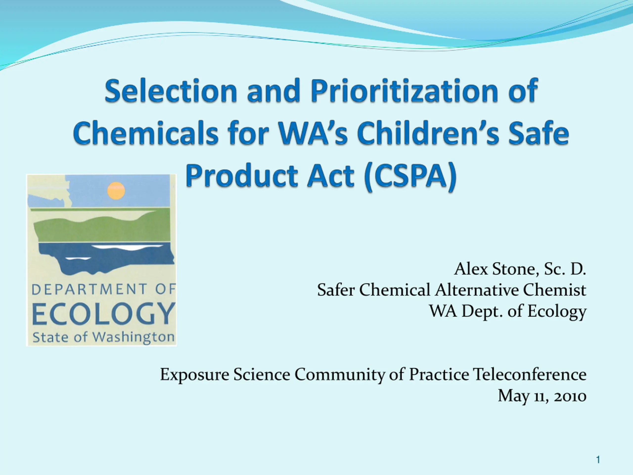 Alex Stone, Sc. D. Safer Chemical Alternative Chemist WA Dept. of Ecology Exposure Science Community of Practice Teleconference May 11, 2010 1