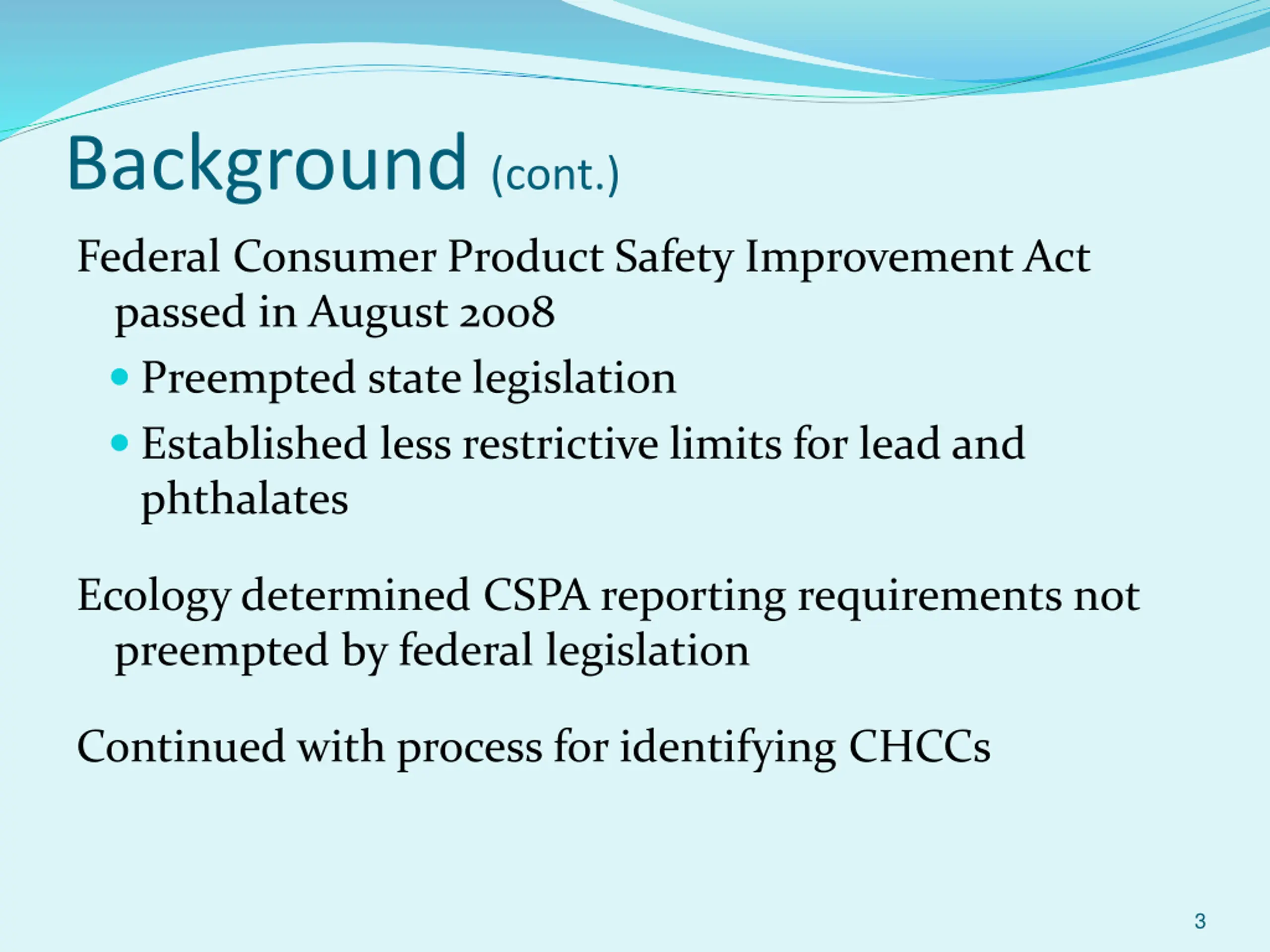 Background (cont.) Federal Consumer Product Safety Improvement Act passed in August 2008 Preempted state legislation Established less restrictive limits for lead and phthalates Ecology determined CSPA reporting requirements not preempted by federal legislation Continued with process for identifying CHCCs 3