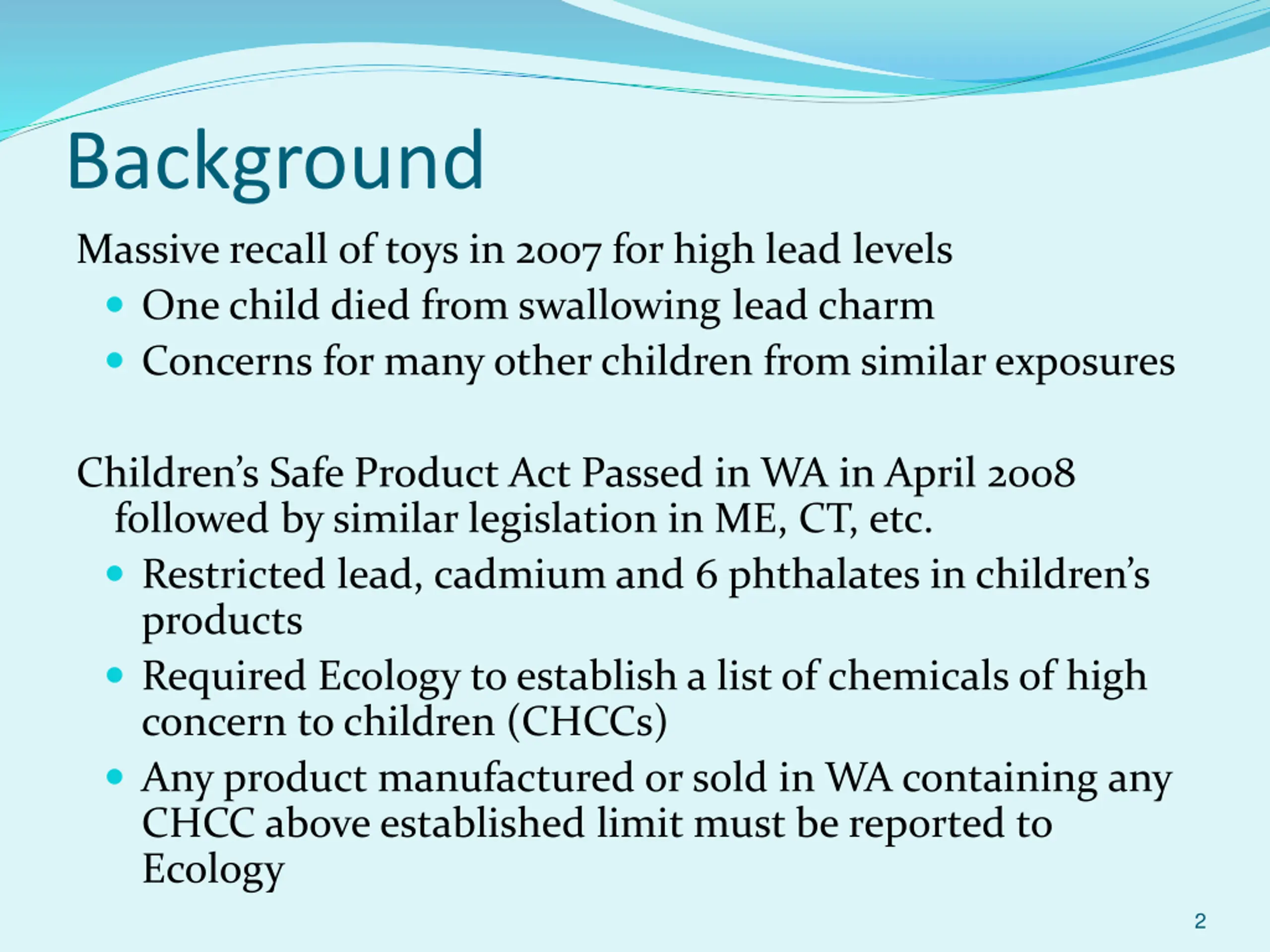 Background Massive recall of toys in 2007 for high lead levels One child died from swallowing lead charm Concerns for many other children from similar exposures Children s Safe Product Act Passed in WA in April 2008 followed by similar legislation in ME, CT, etc. Restricted lead, cadmium and 6 phthalates in children s products Required Ecology to establish a list of chemicals of high concern to children (CHCCs) Any product manufactured or sold in WA containing any CHCC above established limit must be reported to Ecology 2
