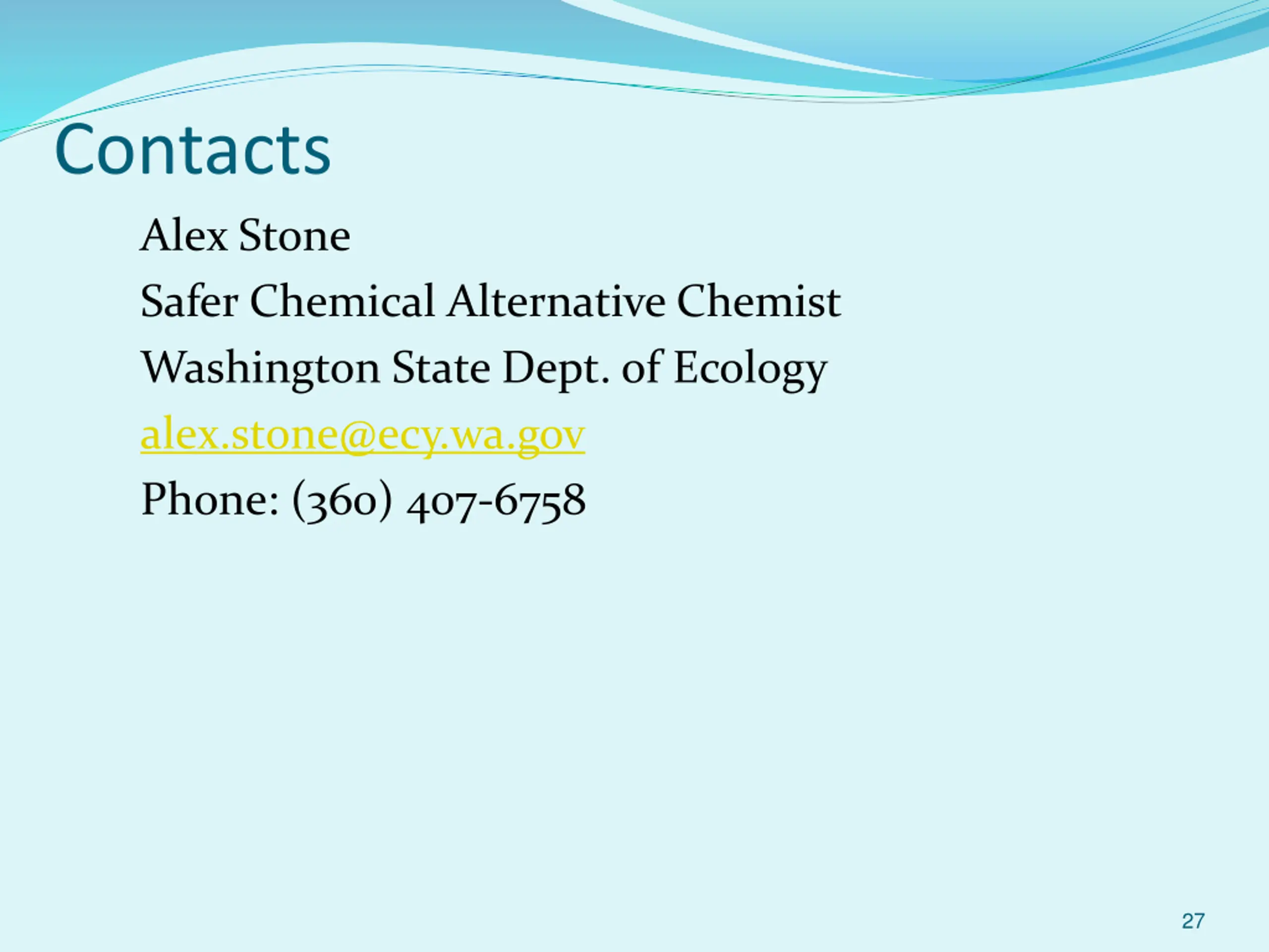 Contacts Alex Stone Safer Chemical Alternative Chemist Washington State Dept. of Ecology alex.stone@ecy.wa.gov Phone: (360) 407-6758 27