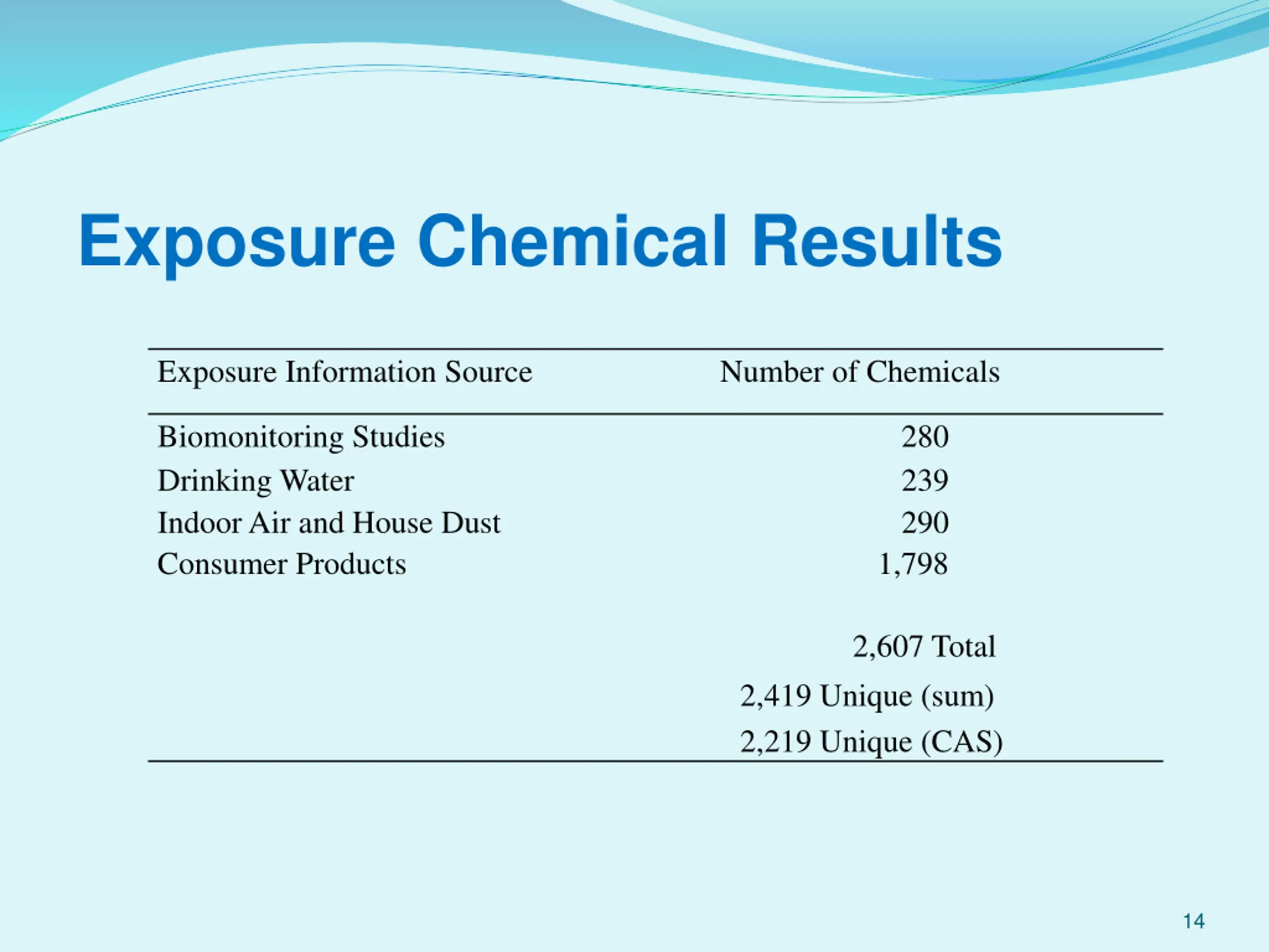 Exposure Chemical Results Exposure Information Source Number of Chemicals Biomonitoring Studies Drinking Water Indoor Air and House Dust Consumer Products 280 239 290 1,798 2,607 Total 2,419 Unique (sum) 2,219 Unique (CAS) 14