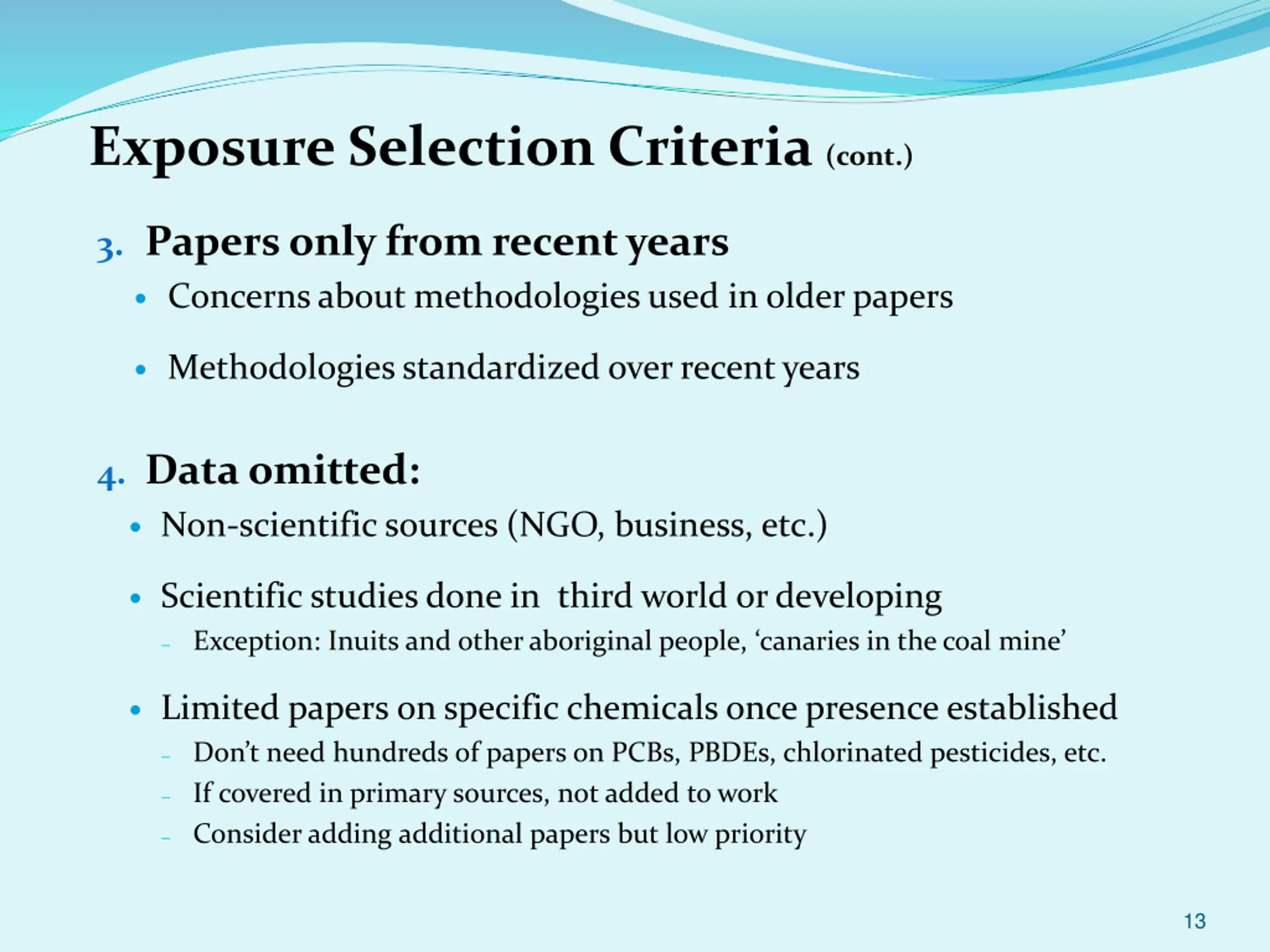 Exposure Selection Criteria (cont.) 3. Papers only from recent years Concerns about methodologies used in older papers Methodologies standardized over recent years 4. Data omitted: Non-scientific sources (NGO, business, etc.) Scientific studies done in third world or developing Exception: Inuits and other aboriginal people, canaries in the coal mine Limited papers on specific chemicals once presence established Don t need hundreds of papers on PCBs, PBDEs, chlorinated pesticides, etc. If covered in primary sources, not added to work Consider adding additional papers but low priority 13