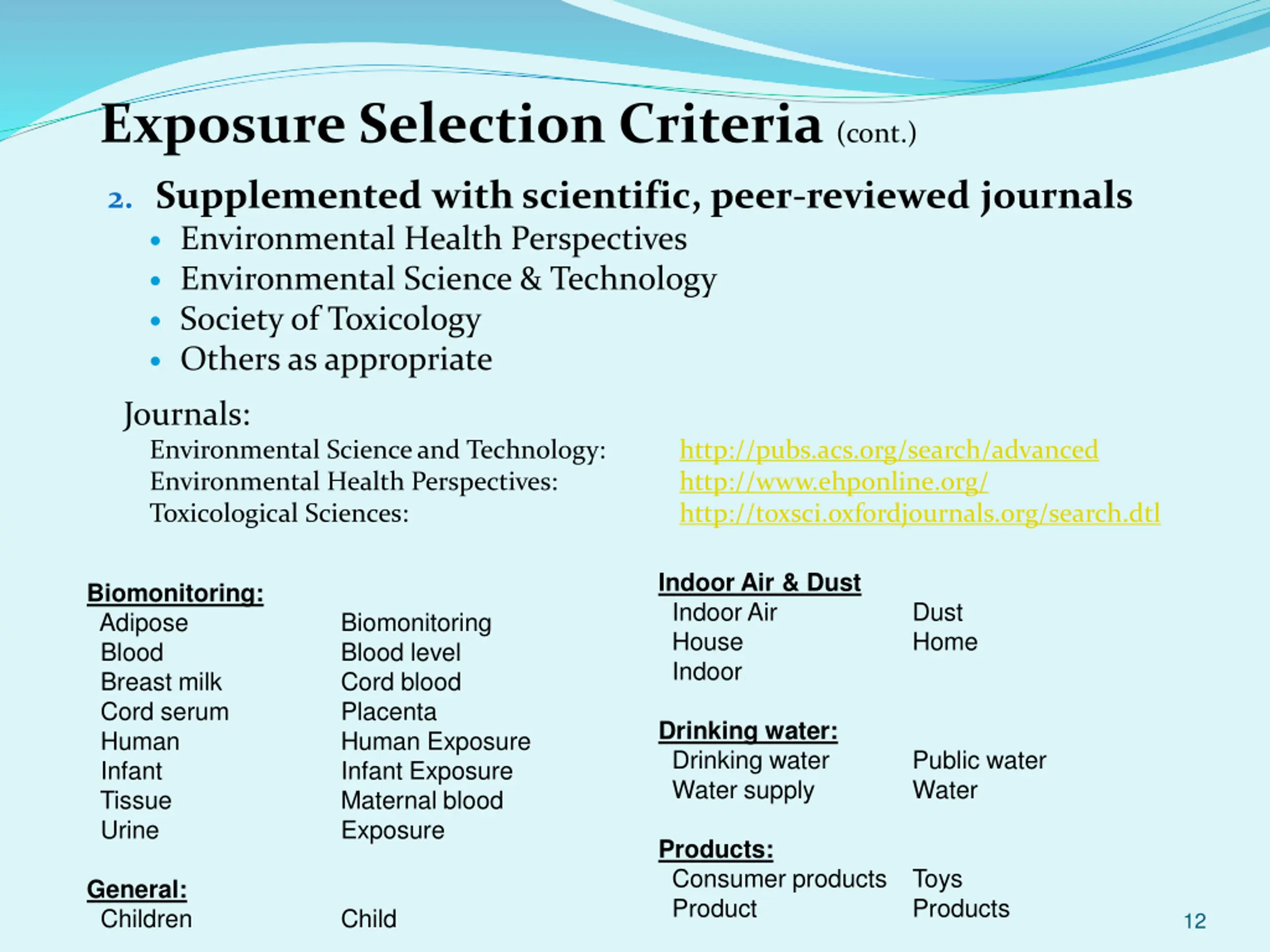 Exposure Selection Criteria (cont.) 2. Supplemented with scientific, peer-reviewed journals Environmental Health Perspectives Environmental Science & Technology Society of Toxicology Others as appropriate Journals: Environmental Science and Technology: Environmental Health Perspectives: Toxicological Sciences: http://pubs.acs.org/search/advanced http://www.ehponline.org/ http://toxsci.oxfordjournals.org/search.dtl Indoor Air & Dust Indoor Air House Indoor Biomonitoring: Adipose Blood Breast milk Cord serum Human Infant Tissue Urine Dust Home Biomonitoring Blood level Cord blood Placenta Human Exposure Infant Exposure Maternal blood Exposure Drinking water: Drinking water Water supply Public water Water Products: Consumer products Toys Product General: Children Products Child 12