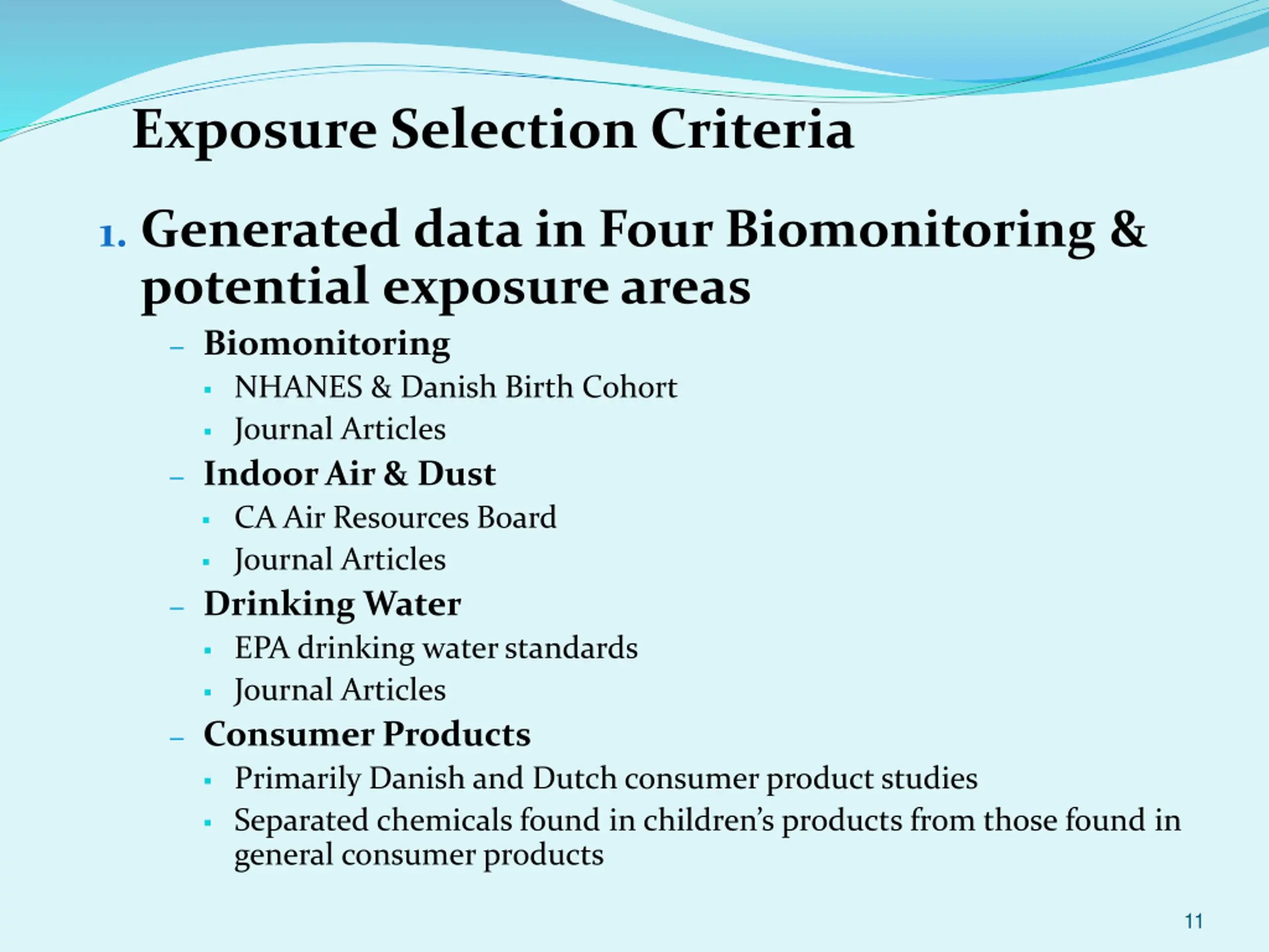 Exposure Selection Criteria 1. Generated data in Four Biomonitoring & potential exposure areas Biomonitoring NHANES & Danish Birth Cohort Journal Articles Indoor Air & Dust CA Air Resources Board Journal Articles Drinking Water EPA drinking water standards Journal Articles Consumer Products Primarily Danish and Dutch consumer product studies Separated chemicals found in children s products from those found in general consumer products 11