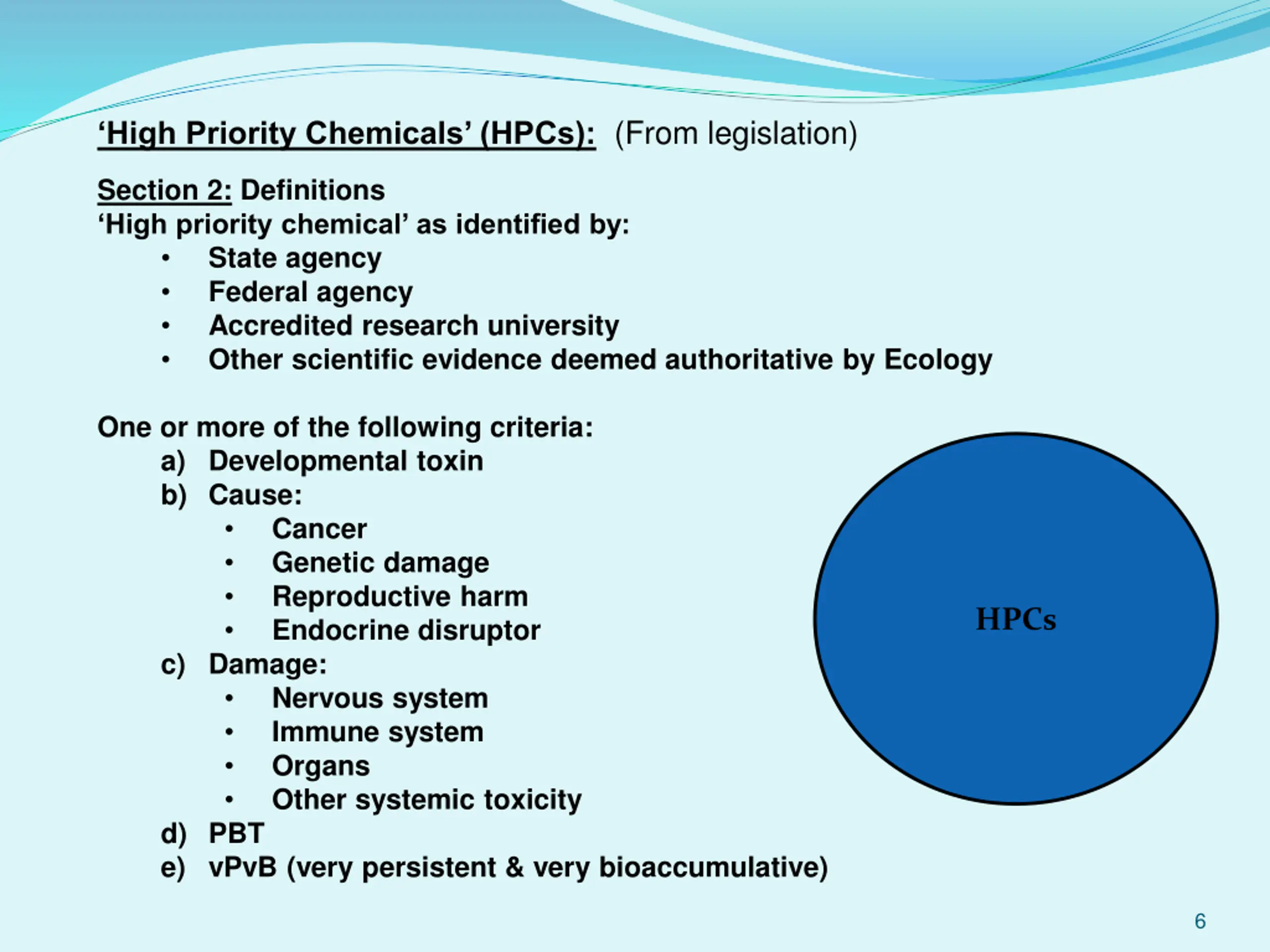 High Priority Chemicals (HPCs): (From legislation) Section 2: Definitions High priority chemical as identified by: State agency Federal agency Accredited research university Other scientific evidence deemed authoritative by Ecology One or more of the following criteria: a) Developmental toxin b) Cause: Cancer Genetic damage Reproductive harm Endocrine disruptor c) Damage: Nervous system Immune system Organs Other systemic toxicity d) PBT e) vPvB (very persistent & very bioaccumulative) HPCs 6