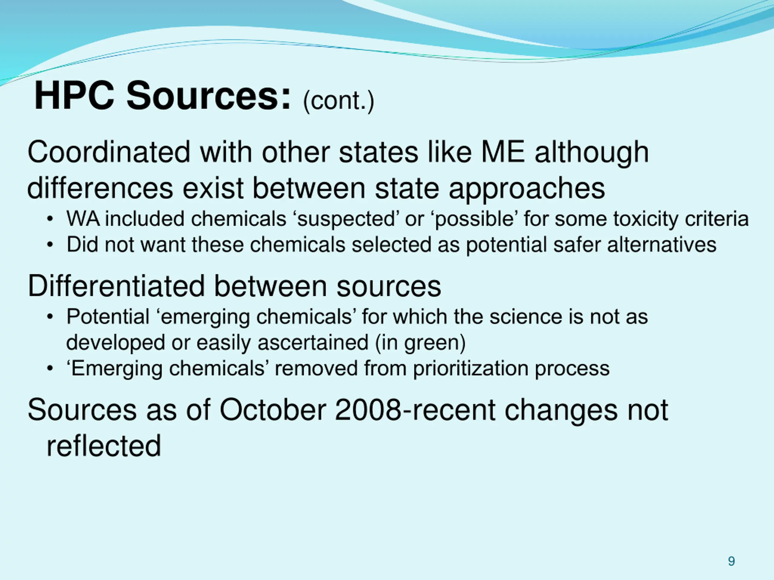 HPC Sources: (cont.) Coordinated with other states like ME although differences exist between state approaches WA included chemicals suspected or possible for some toxicity criteria Did not want these chemicals selected as potential safer alternatives Differentiated between sources Potential emerging chemicals for which the science is not as developed or easily ascertained (in green) Emerging chemicals removed from prioritization process Sources as of October 2008-recent changes not reflected 9