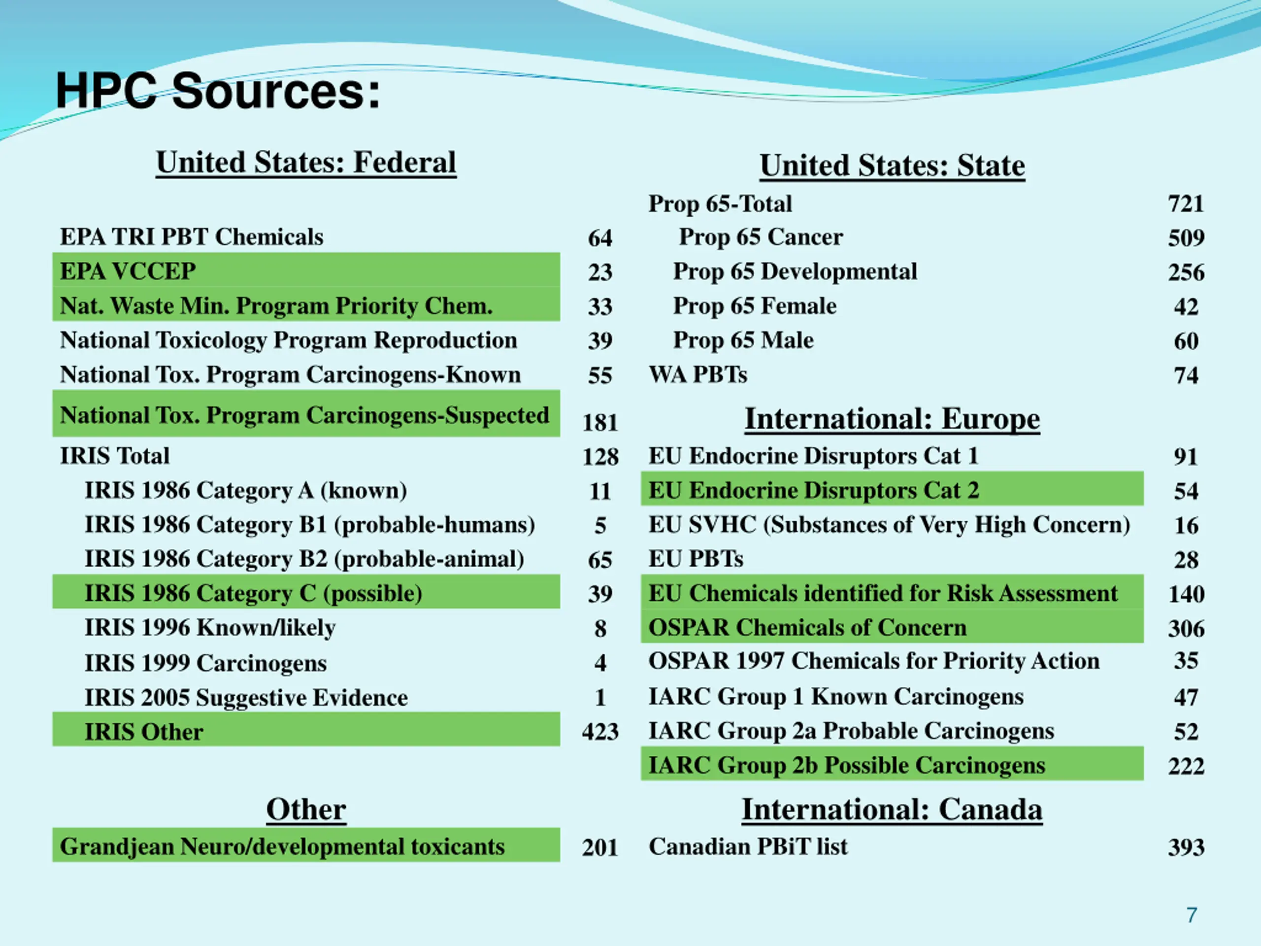 HPC Sources: United States: Federal United States: State Prop 65-Total Prop 65 Cancer Prop 65 Developmental Prop 65 Female Prop 65 Male WA PBTs International: Europe EU Endocrine Disruptors Cat 1 EU Endocrine Disruptors Cat 2 EU SVHC (Substances of Very High Concern) EU PBTs EU Chemicals identified for Risk Assessment OSPAR Chemicals of Concern OSPAR 1997 Chemicals for Priority Action IARC Group 1 Known Carcinogens IARC Group 2a Probable Carcinogens IARC Group 2b Possible Carcinogens International: Canada Canadian PBiT list 721 509 256 42 60 74 EPA TRI PBT Chemicals EPA VCCEP Nat. Waste Min. Program Priority Chem. National Toxicology Program Reproduction National Tox. Program Carcinogens-Known National Tox. Program Carcinogens-Suspected IRIS Total IRIS 1986 Category A (known) IRIS 1986 Category B1 (probable-humans) IRIS 1986 Category B2 (probable-animal) IRIS 1986 Category C (possible) IRIS 1996 Known/likely IRIS 1999 Carcinogens IRIS 2005 Suggestive Evidence IRIS Other 64 23 33 39 55 181 128 11 5 65 39 8 4 1 423 91 54 16 28 140 306 35 47 52 222 Other Grandjean Neuro/developmental toxicants 201 393 7