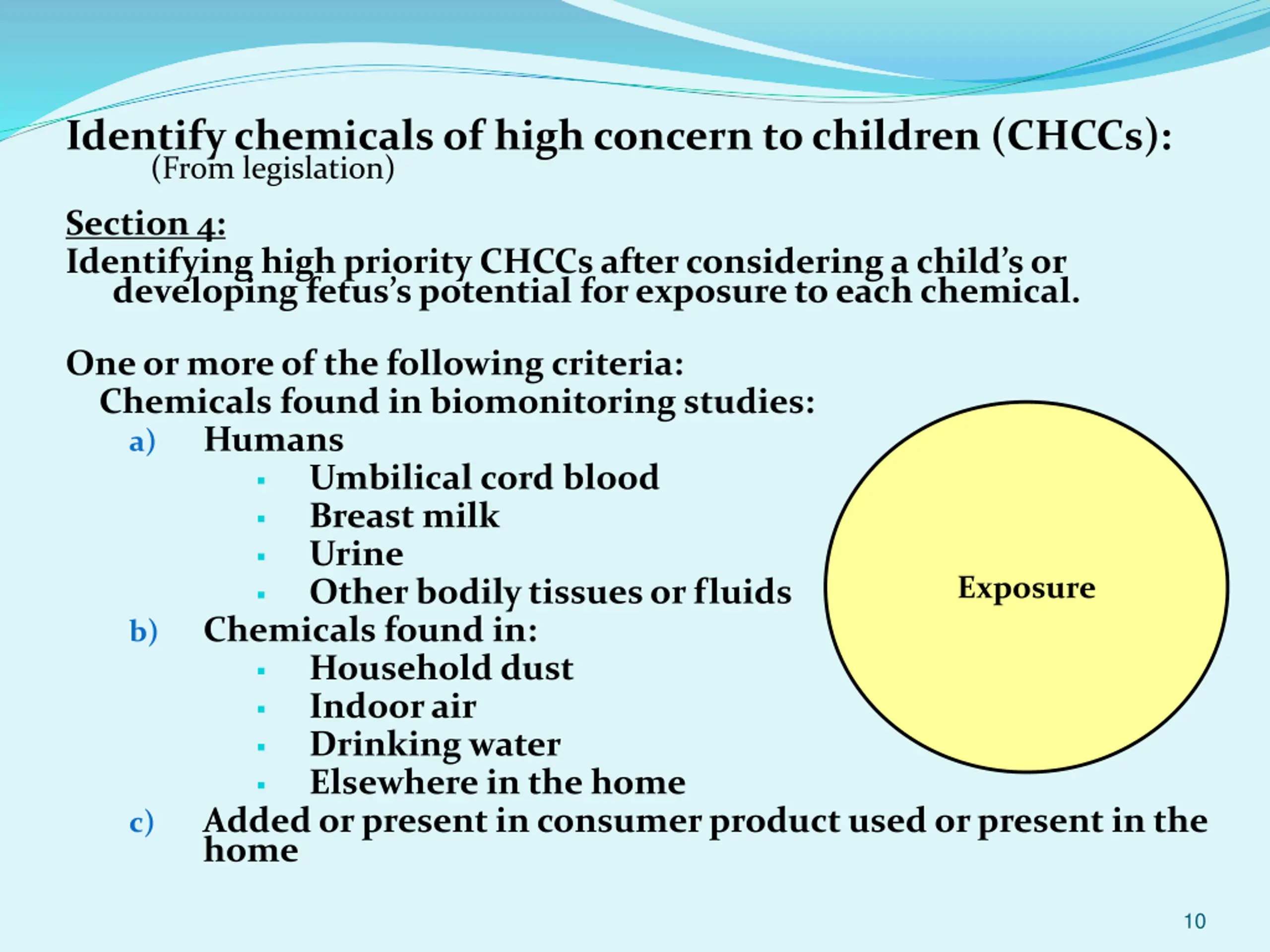 Identify chemicals of high concern to children (CHCCs): (From legislation) Section 4: Identifying high priority CHCCs after considering a child s or developing fetus s potential for exposure to each chemical. One or more of the following criteria: Chemicals found in biomonitoring studies: a) Humans Umbilical cord blood Breast milk Urine Other bodily tissues or fluids b) Chemicals found in: Household dust Indoor air Drinking water Elsewhere in the home c) Added or present in consumer product used or present in the home Exposure 10