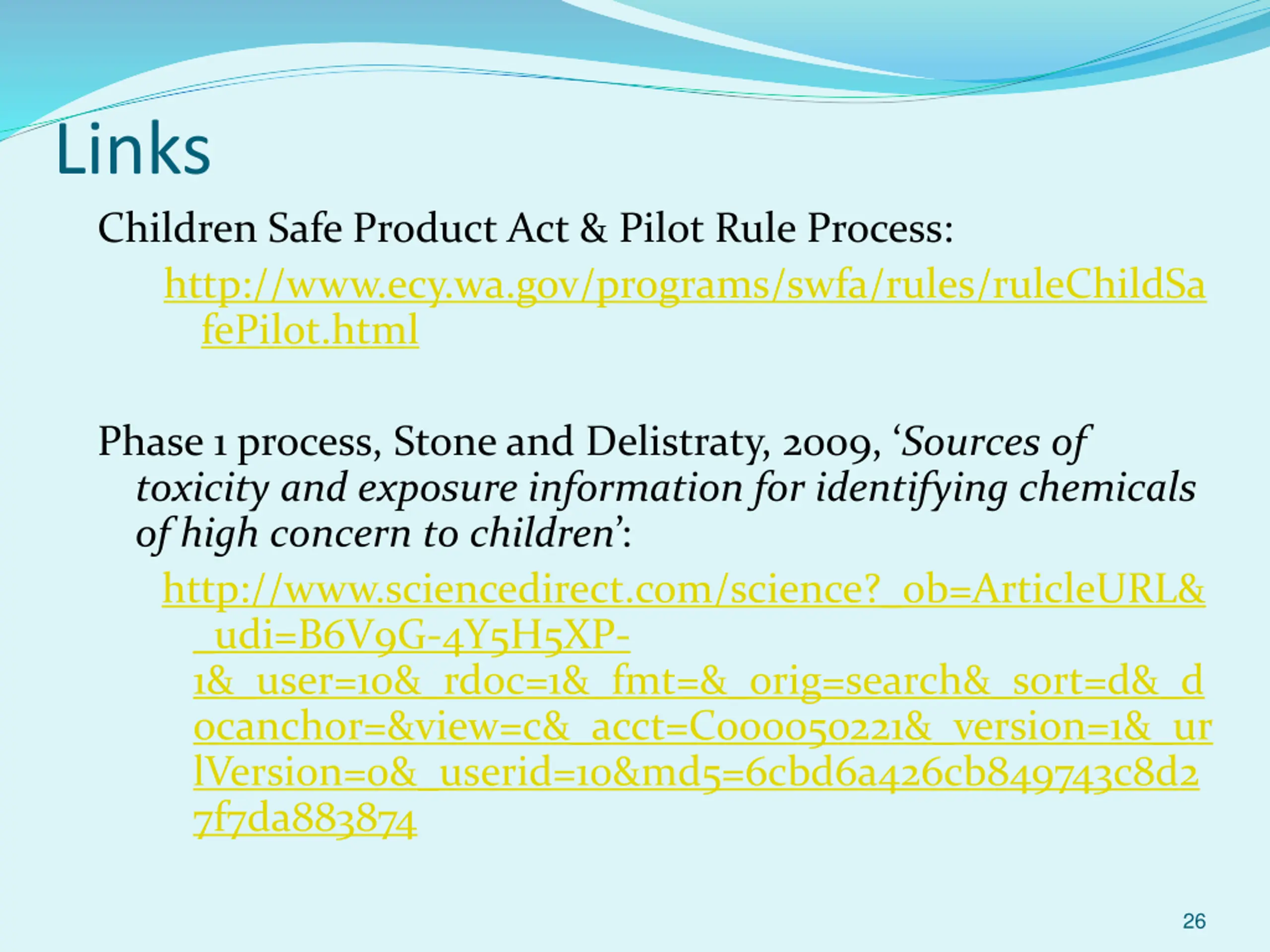 Links Children Safe Product Act & Pilot Rule Process: http://www.ecy.wa.gov/programs/swfa/rules/ruleChildSa fePilot.html Phase 1 process, Stone and Delistraty, 2009, Sources of toxicity and exposure information for identifying chemicals of high concern to children : http://www.sciencedirect.com/science?_ob=ArticleURL& _udi=B6V9G-4Y5H5XP- 1&_user=10&_rdoc=1&_fmt=&_orig=search&_sort=d&_d ocanchor=&view=c&_acct=C000050221&_version=1&_ur lVersion=0&_userid=10&md5=6cbd6a426cb849743c8d2 7f7da883874 26