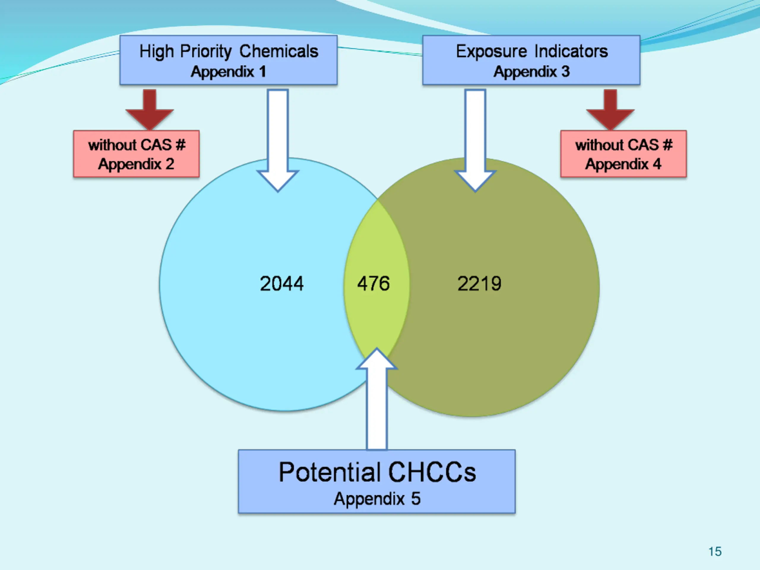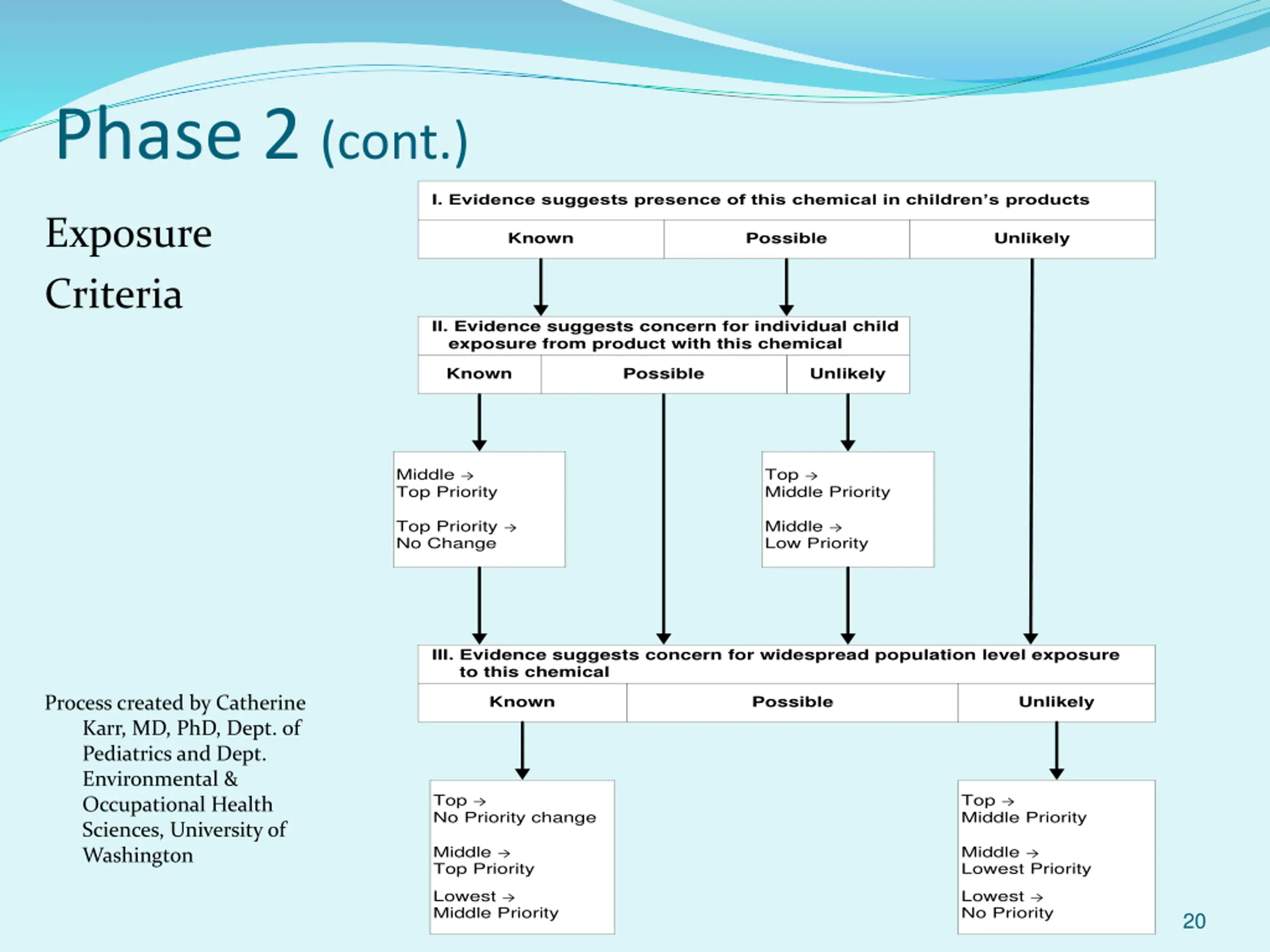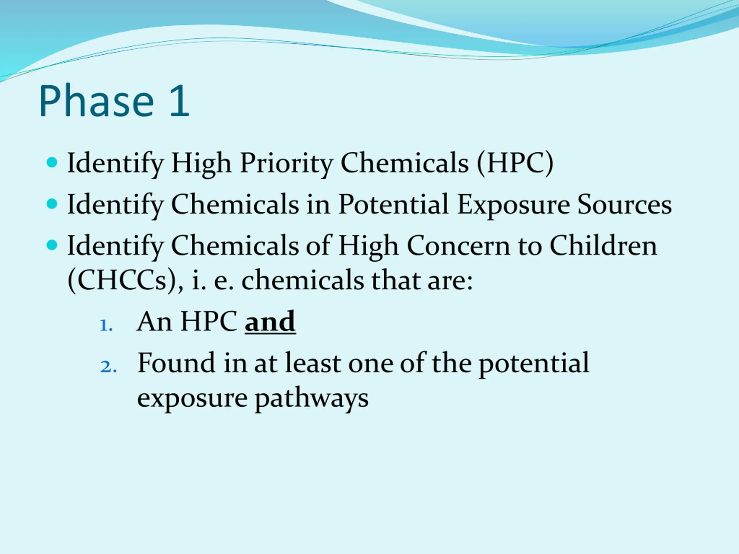Phase 1 Identify High Priority Chemicals (HPC) Identify Chemicals in Potential Exposure Sources Identify Chemicals of High Concern to Children (CHCCs), i. e. chemicals that are: 1. An HPC and 2. Found in at least one of the potential exposure pathways