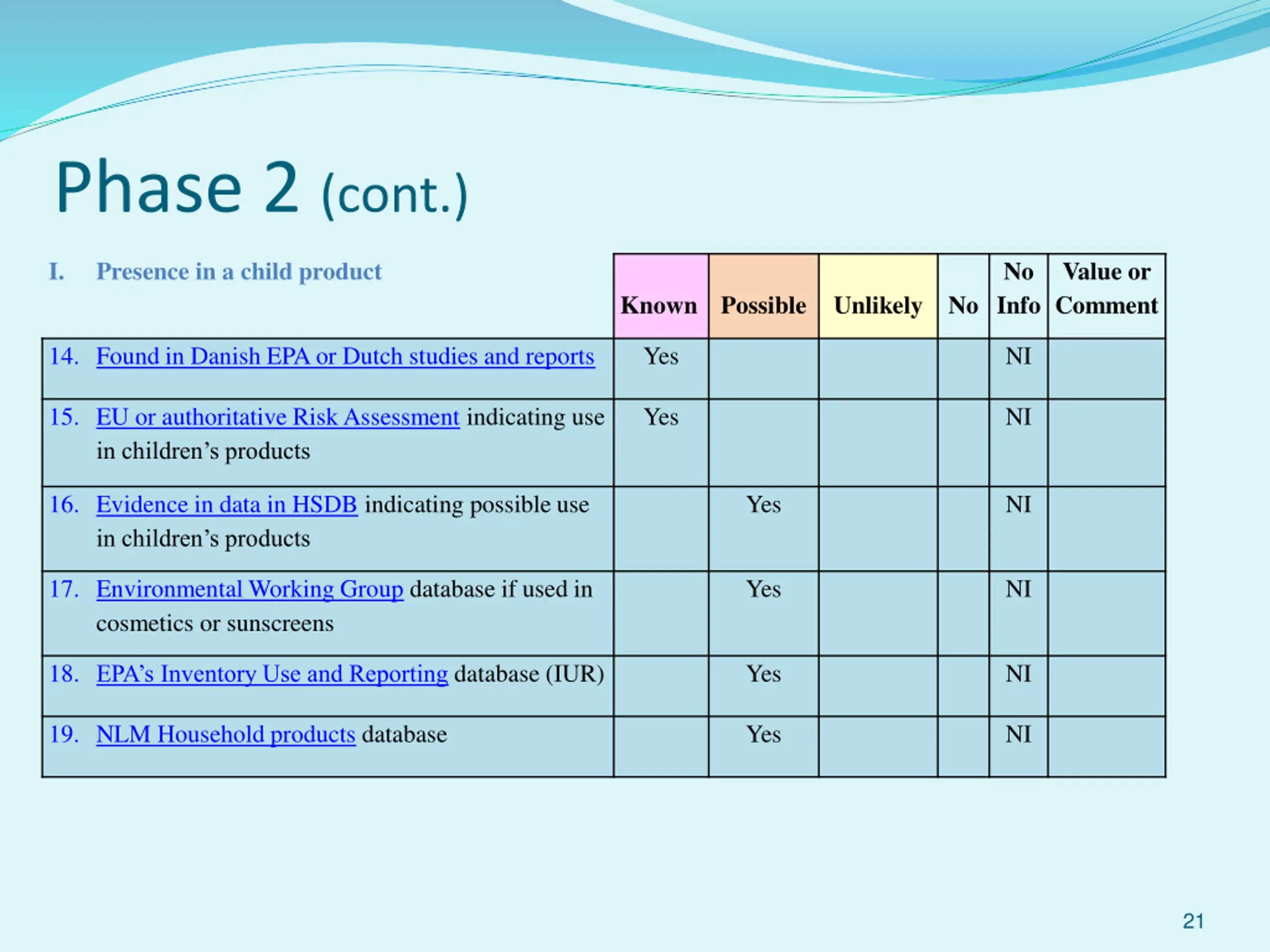 Phase 2 (cont.) I. Presence in a child product No Info Value or Comment Known Possible Unlikely No 14. Found in Danish EPA or Dutch studies and reports Yes NI 15. EU or authoritative Risk Assessment indicating use in children s products Yes NI 16. Evidence in data in HSDB indicating possible use in children s products Yes NI 17. Environmental Working Group database if used in cosmetics or sunscreens Yes NI 18. EPA s Inventory Use and Reporting database (IUR) Yes NI 19. NLM Household products database Yes NI 21