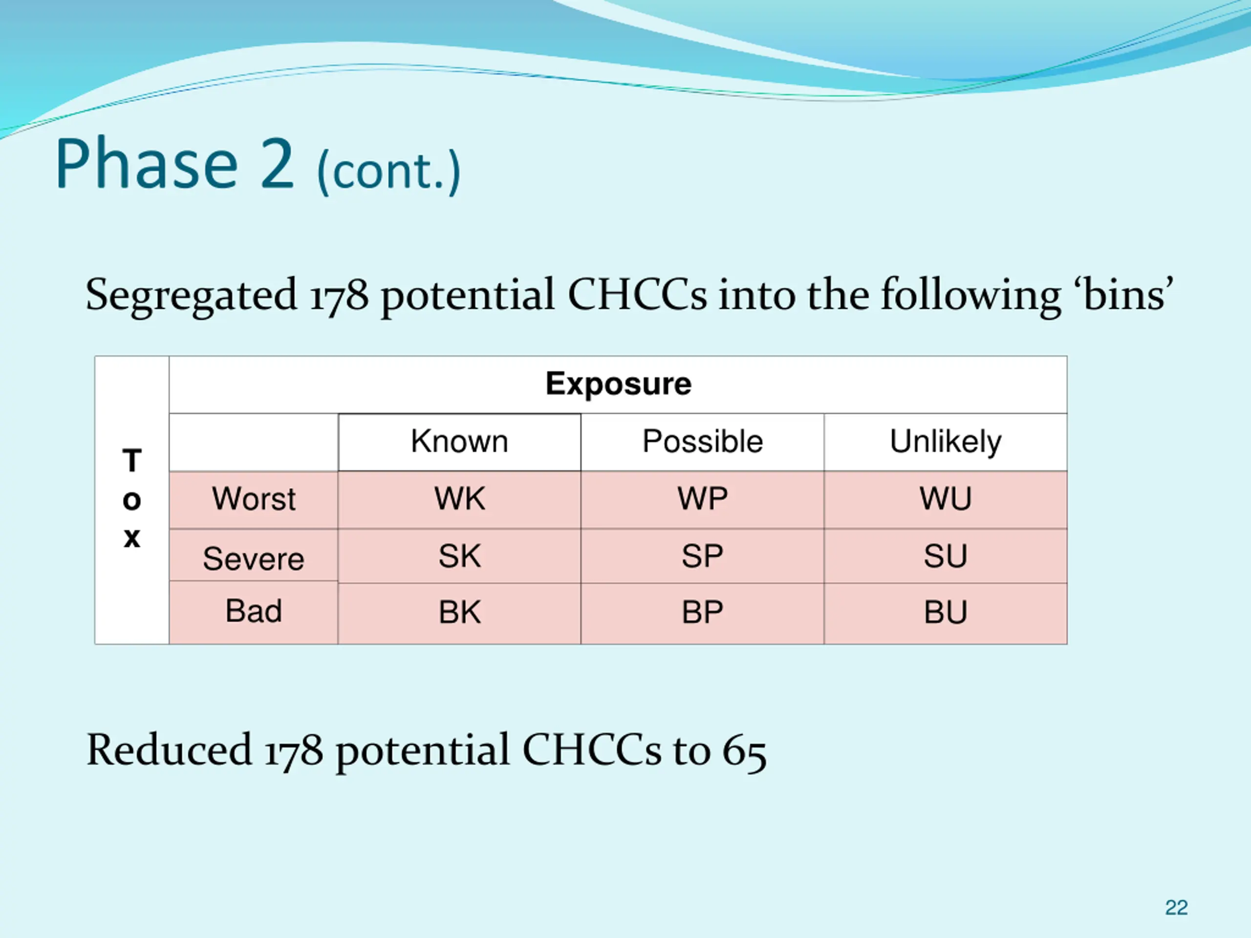 Phase 2 (cont.) Segregated 178 potential CHCCs into the following bins Exposure Known Possible Unlikely T o x Worst WK WP WU SK SP SU Severe Bad BK BP BU Reduced 178 potential CHCCs to 65 22