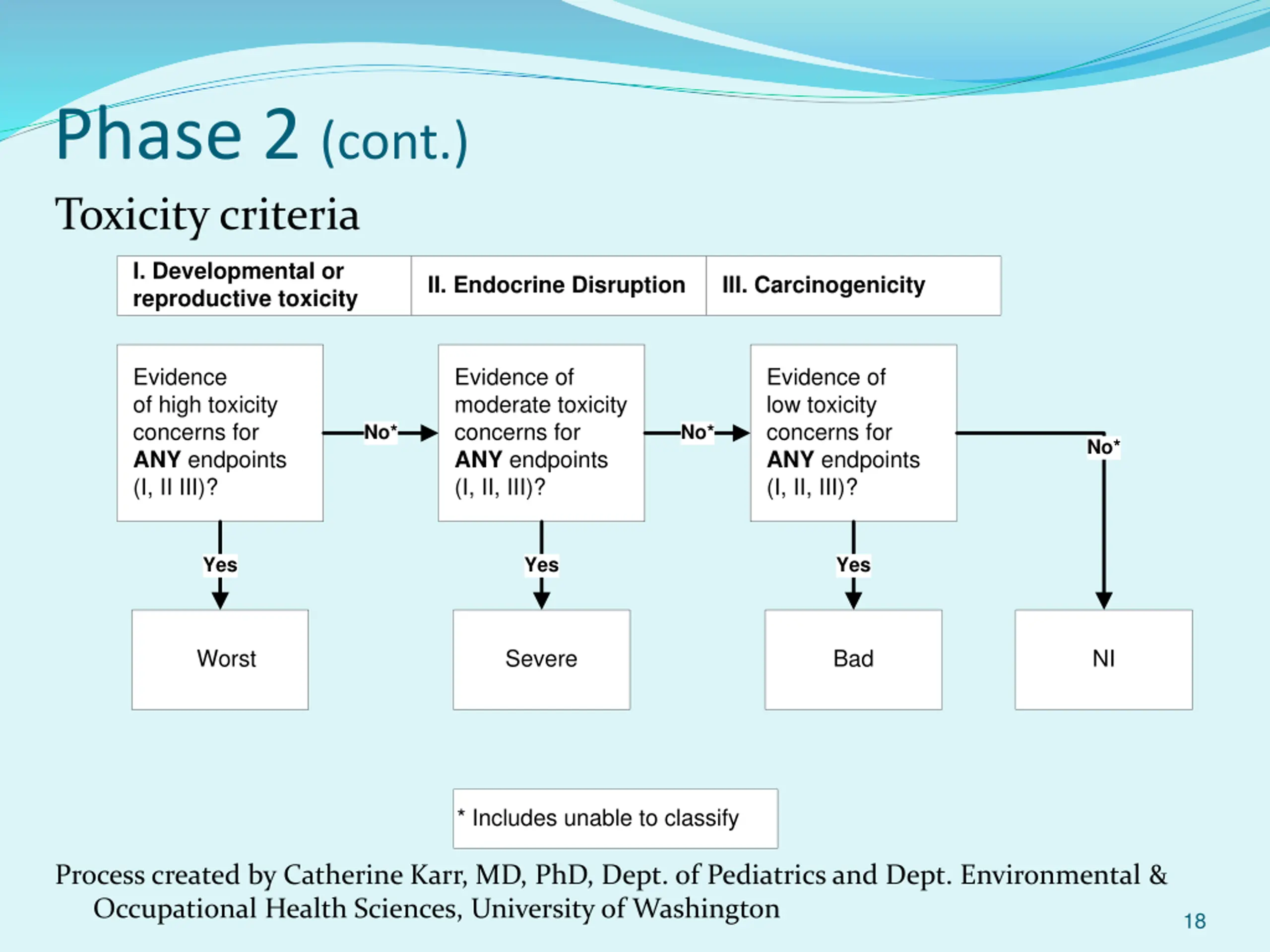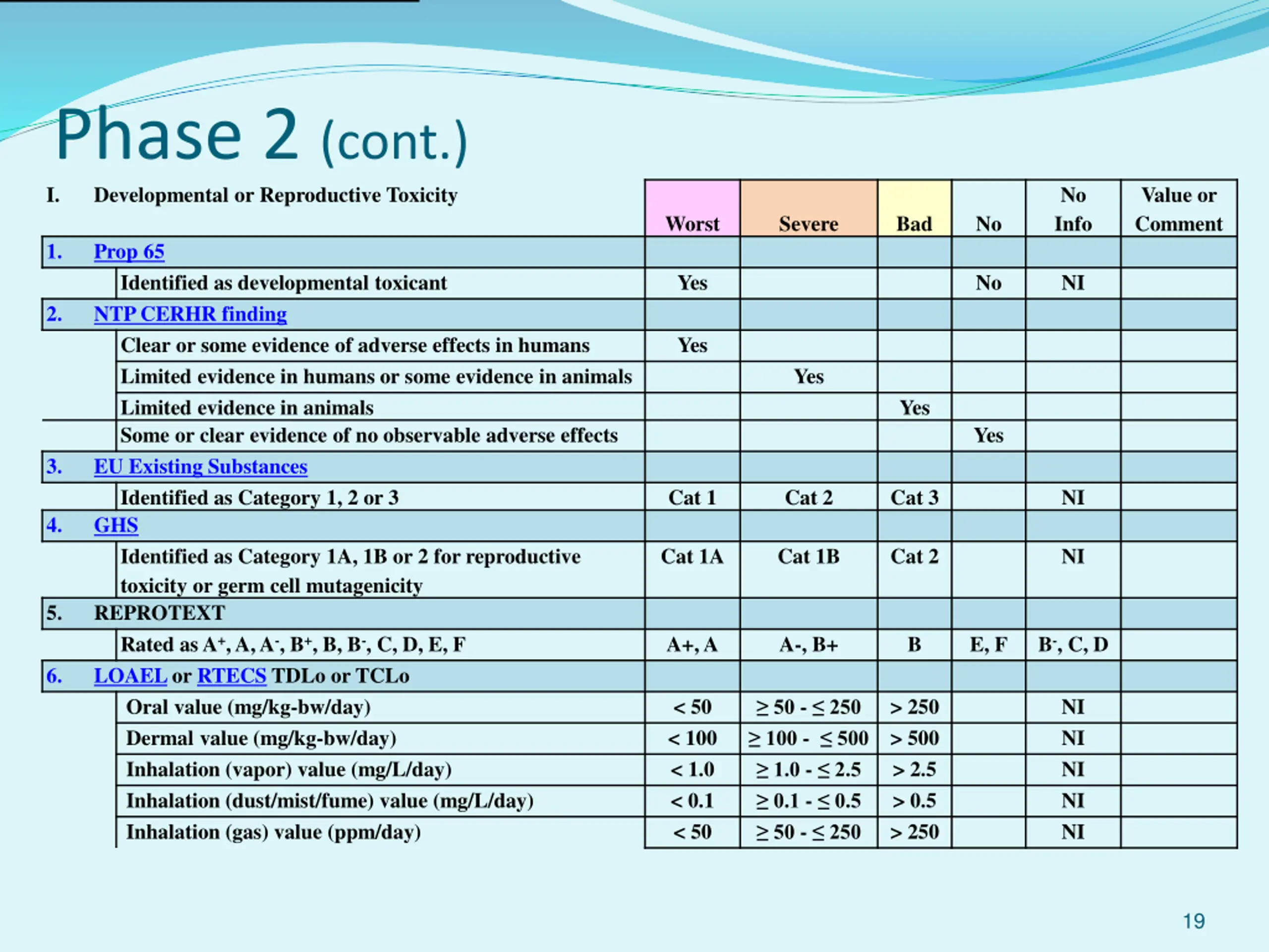 Phase 2 (cont.) Toxicity criteria I. Developmental or reproductive toxicity II. Endocrine Disruption III. Carcinogenicity Evidence of high toxicity concerns for ANY endpoints (I, II III)? Evidence of moderate toxicity concerns for ANY endpoints (I, II, III)? Evidence of low toxicity concerns for ANY endpoints (I, II, III)? No* No* No* Yes Yes Yes Worst Severe Bad NI * Includes unable to classify Process created by Catherine Karr, MD, PhD, Dept. of Pediatrics and Dept. Environmental & Occupational Health Sciences, University of Washington 18